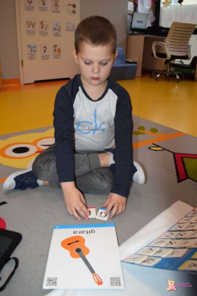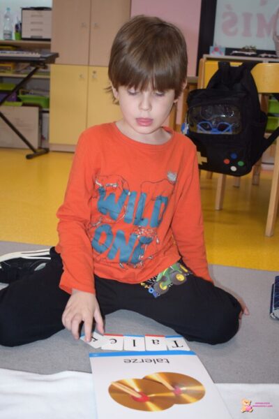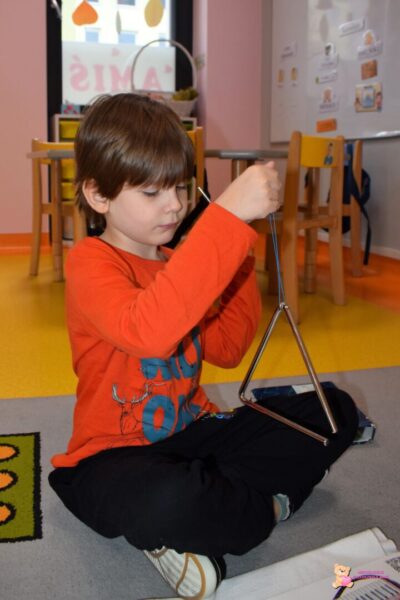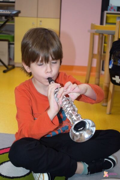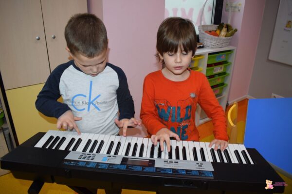 Przedszkolaki przeniosły się także w muzyczną krainę poznając instrumenty, ich nazwy oraz zapoznawały się z ich dźwiękami. Największa radość wśród wszystkich instrumentów muzycznych przyniósł chłopcom keyboard, na którym chętnie grali w rytm podanej melodii.