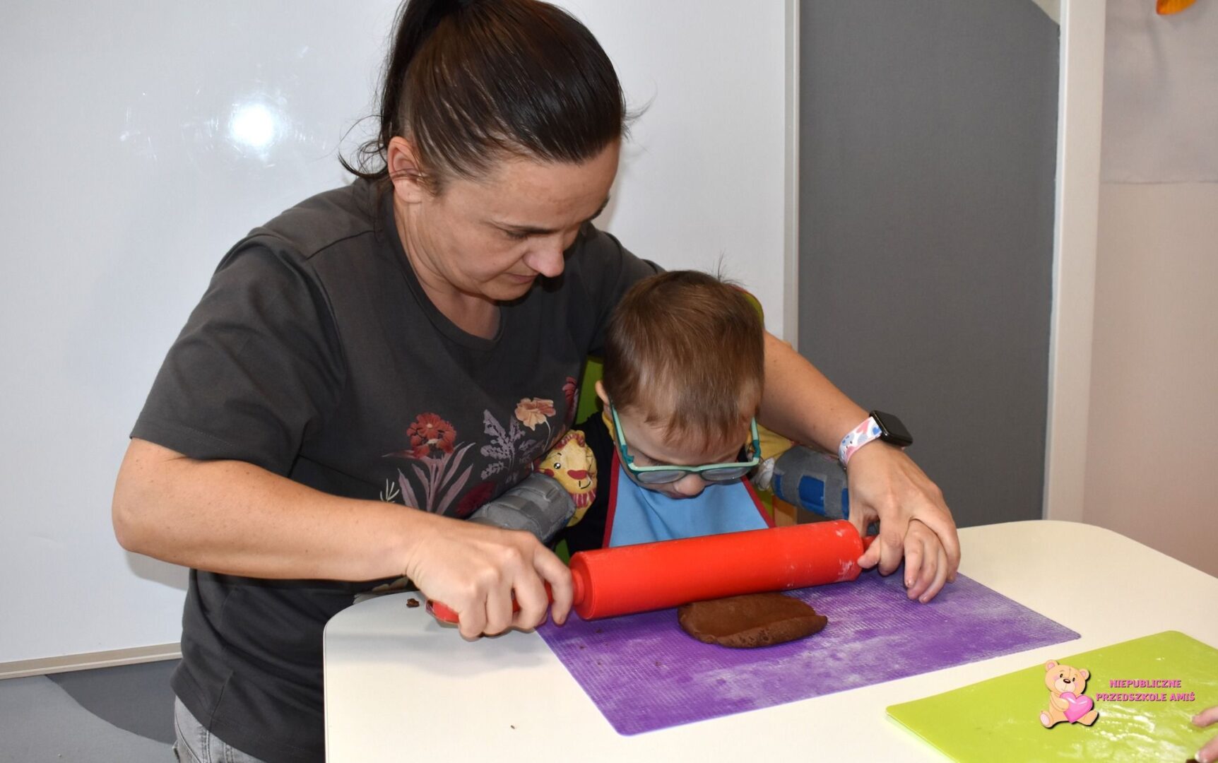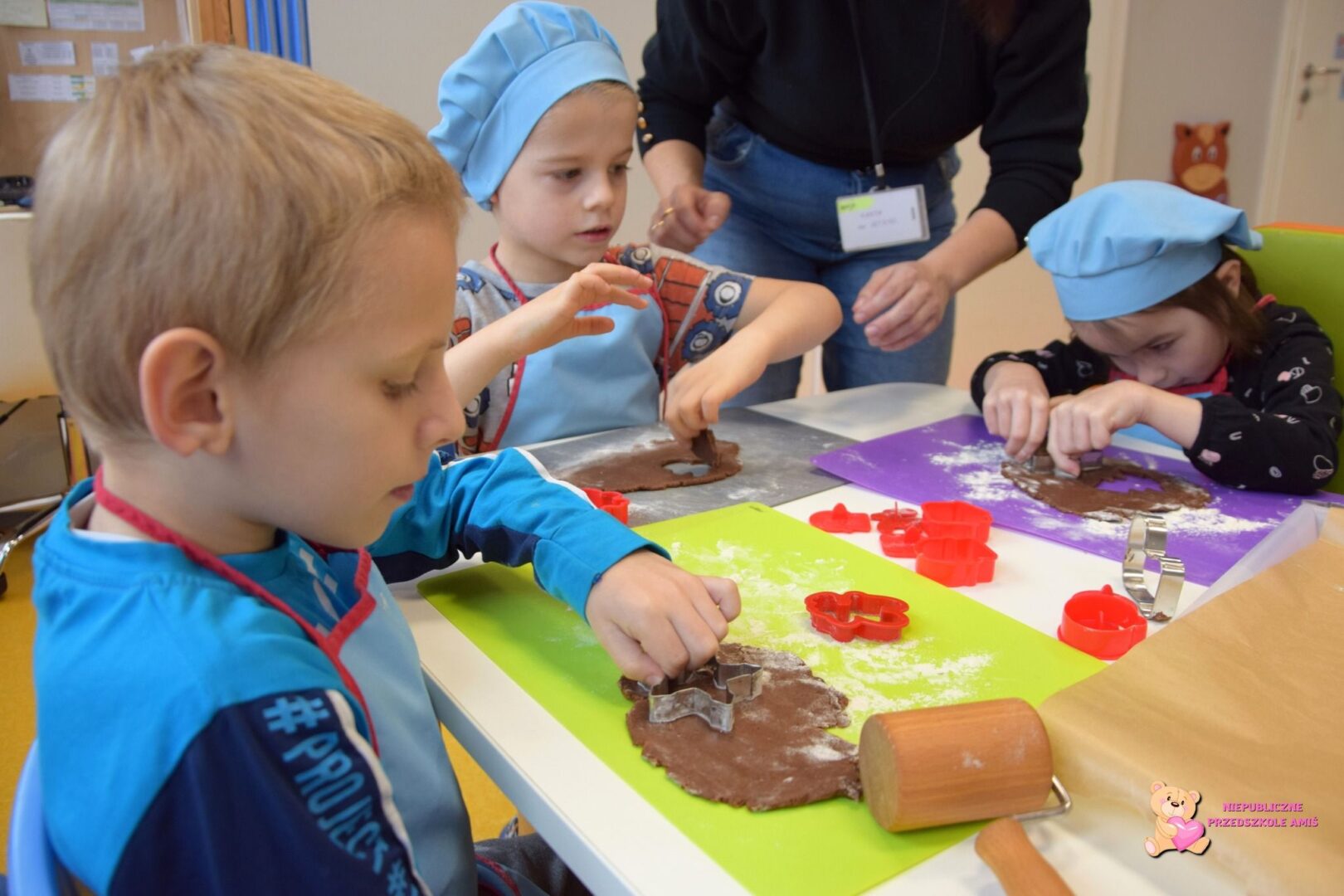 W piątek w Amisiowym Przedszkolu odbyły się zajęcia z Kuchcikowa. Te wyjątkowo pachnące i pełne radości zajęcia rozwijały u dzieci motorykę małą, zmysł zapachu i dotyku. Mimo, iż do świąt jeszcze dużo czasu my zabraliśmy się do pracy wcześniej, bo jak wiadomo małe elfy Mikołaja nie zostawiają świątecznych obowiązków na ostatnią chwilę. Amisiaki wałkowały i wykrawały różnorodne kształty pierniczków – od tradycyjnych serduszek po świąteczne choinki i reniferki. W całym przedszkolu unosił się zapach korzennych przypraw i miłej atmosfery.