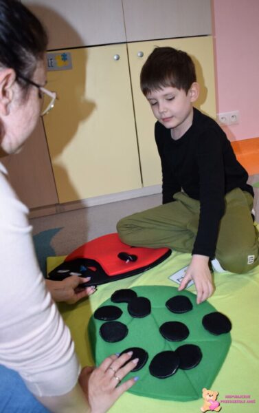 do plansz i poznawali ich nazwy. Przedszkolaki wzięły udział w zabawie matematycznej, podczas której losowali cyfrę i przyklejali na biedronkę