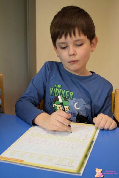 . Amisiaki poznały kolejną literkę „Ł jak łąka”. Najpierw zapoznały się z jej kształtem, kreśliły go w powietrzu i na stoliku, pisały po śladzie i w liniaturze, a następnie wyklejały jej kontury kolorowymi kwiatkami