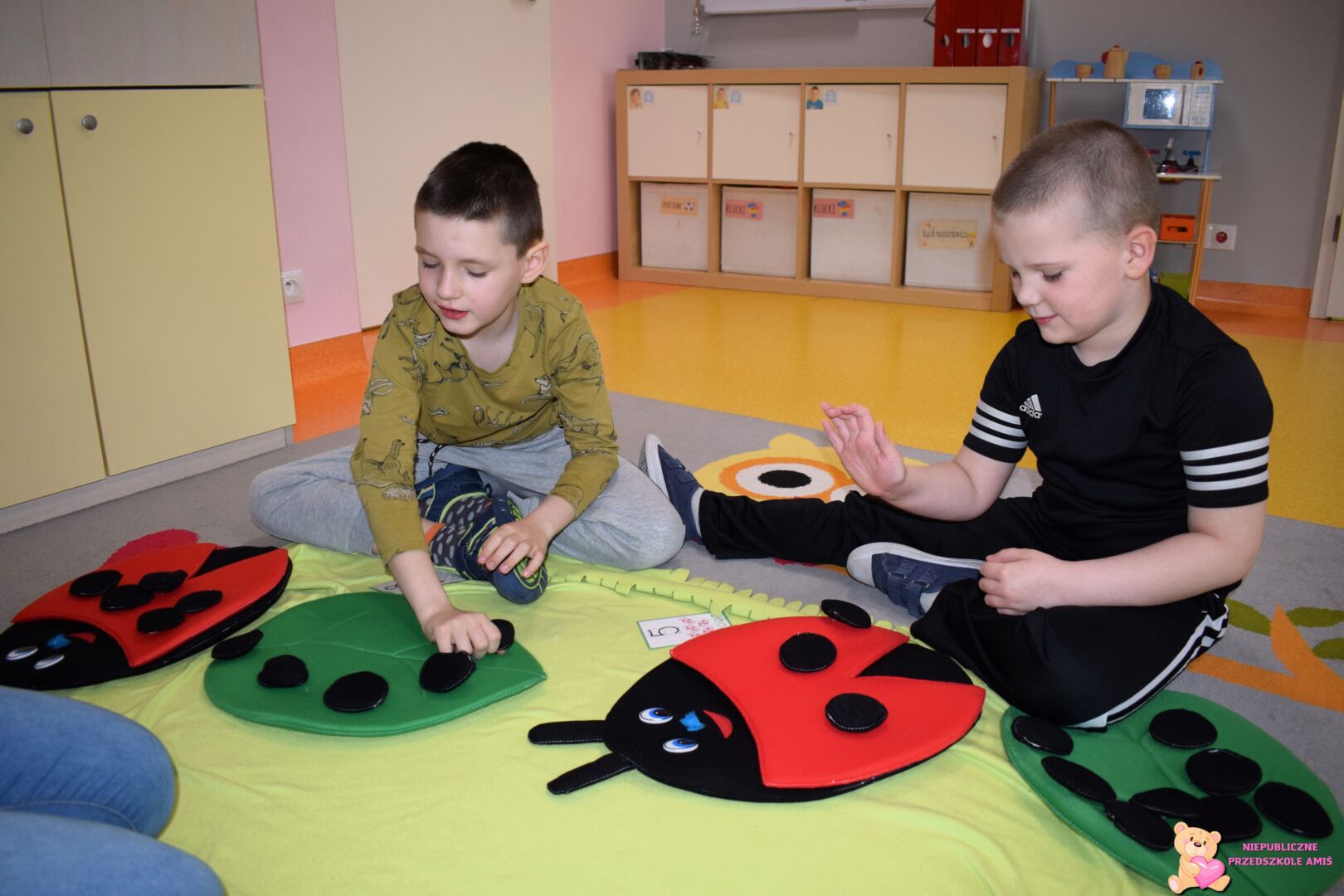 do plansz i poznawali ich nazwy. Przedszkolaki wzięły udział w zabawie matematycznej, podczas której losowali cyfrę i przyklejali na biedronkę