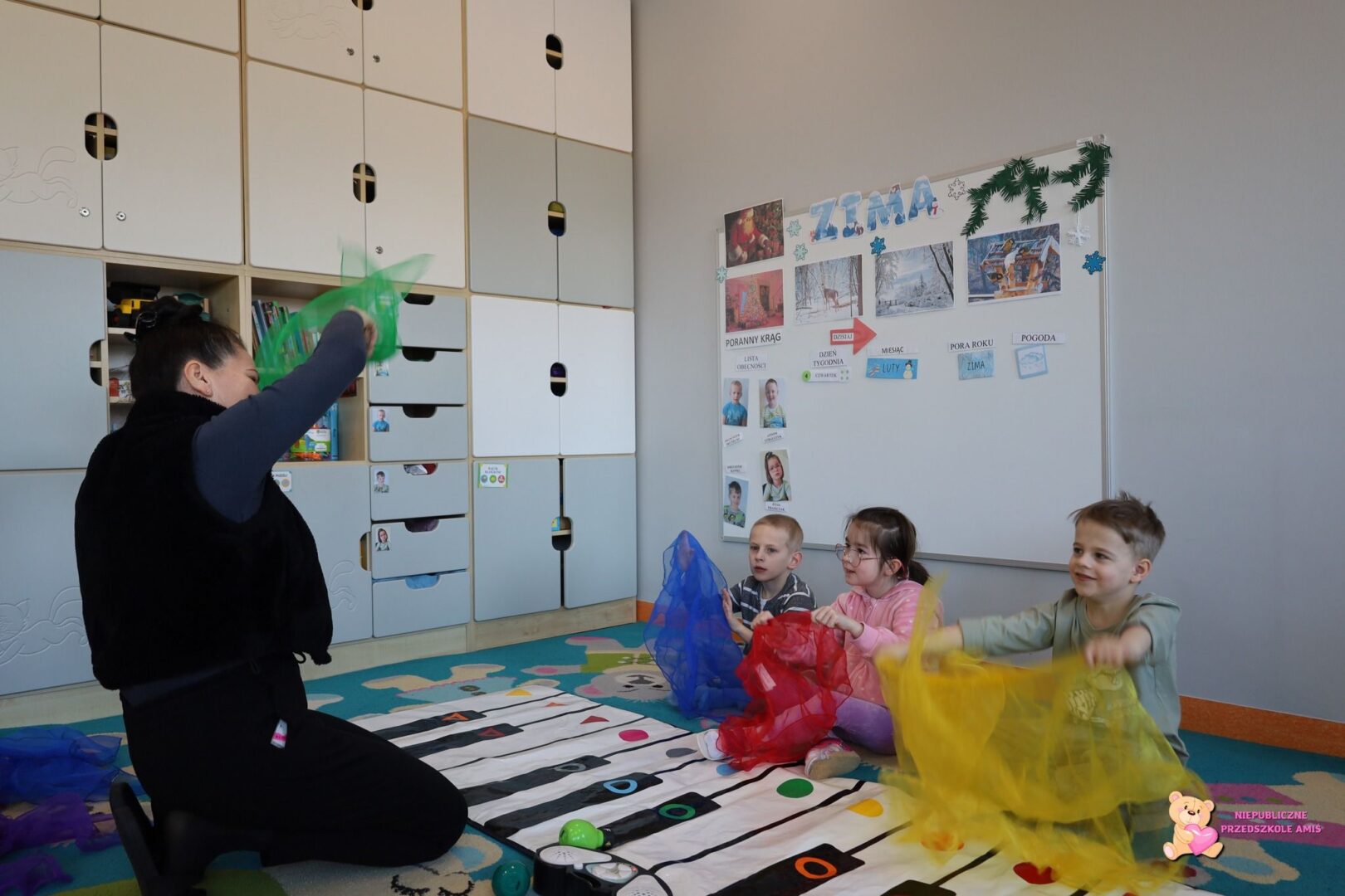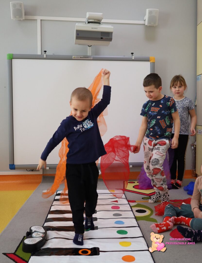 W dniu dzisiejszym nasze przedszkolaki uczestniczyły w kreatywnych zajęciach z wykorzystaniem pianina podłogowego 🎹. To wyjątkowa forma pracy, w której ruch, kolor i dźwięk łączą się w jedno doświadczenie sensoryczne. Każdy klawisz ma swój kolor i dźwięk. Dzieci poruszając się po macie grają ciałem. Skaczą, stąpają, zatrzymują się tworząc własne melodie. Poprzez taniec, gest i pracę z lekkimi, barwnymi chustkami dzieci wyrażały emocje w sposób naturalny i niewerbalny.😁😁