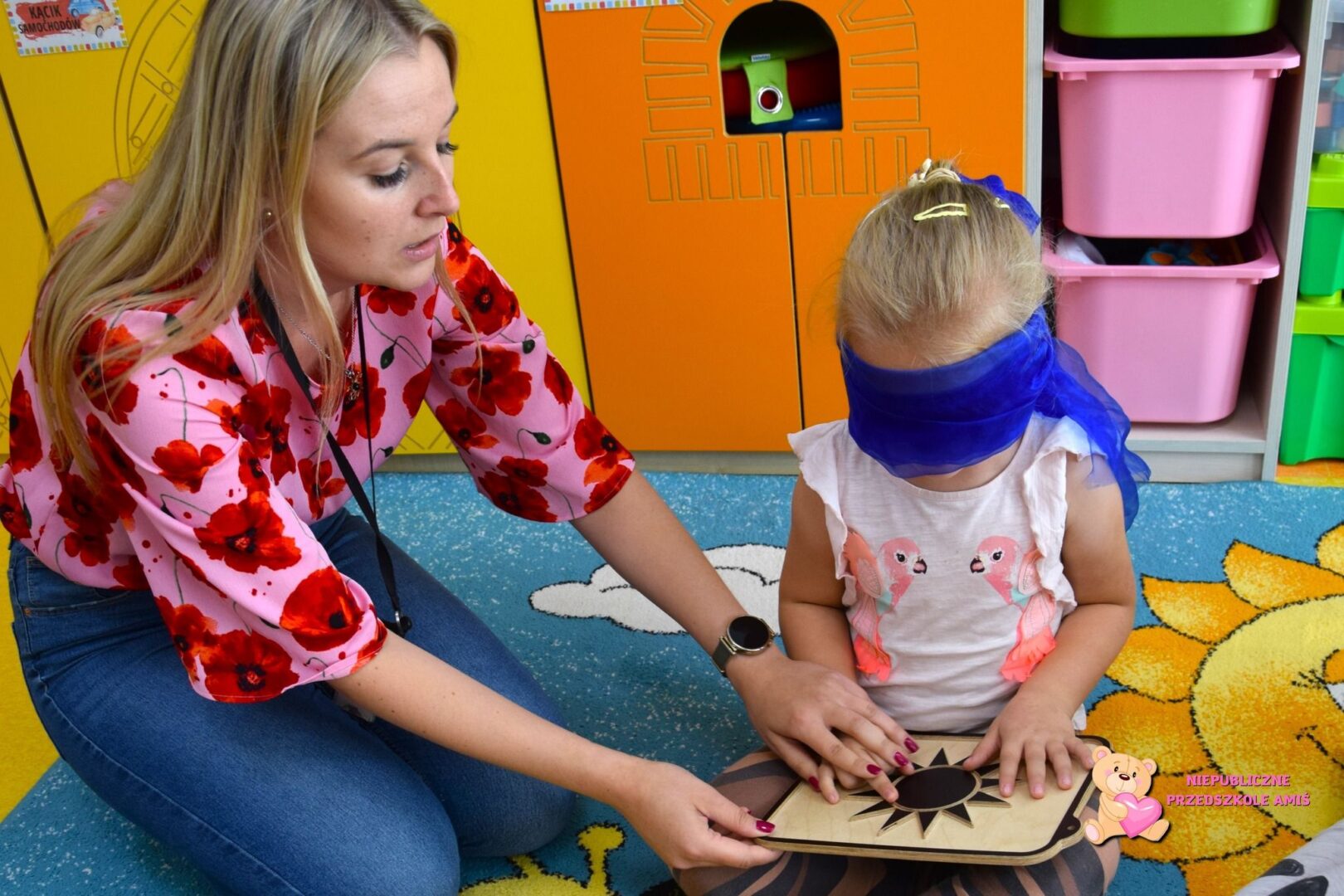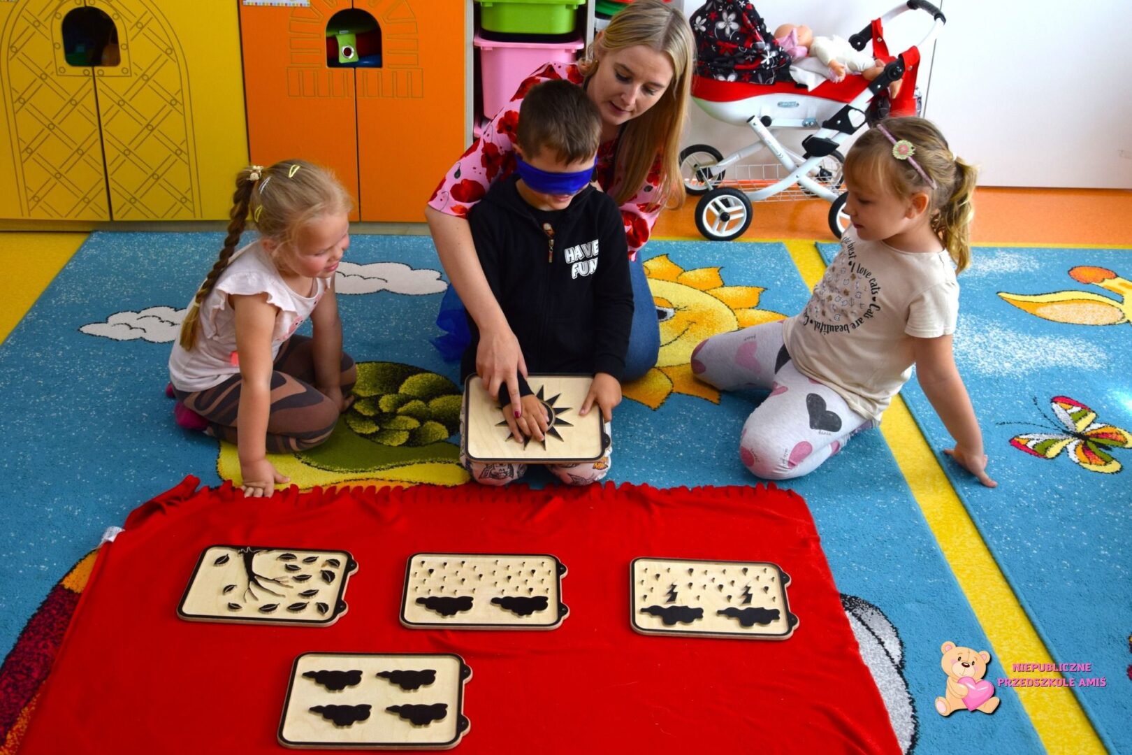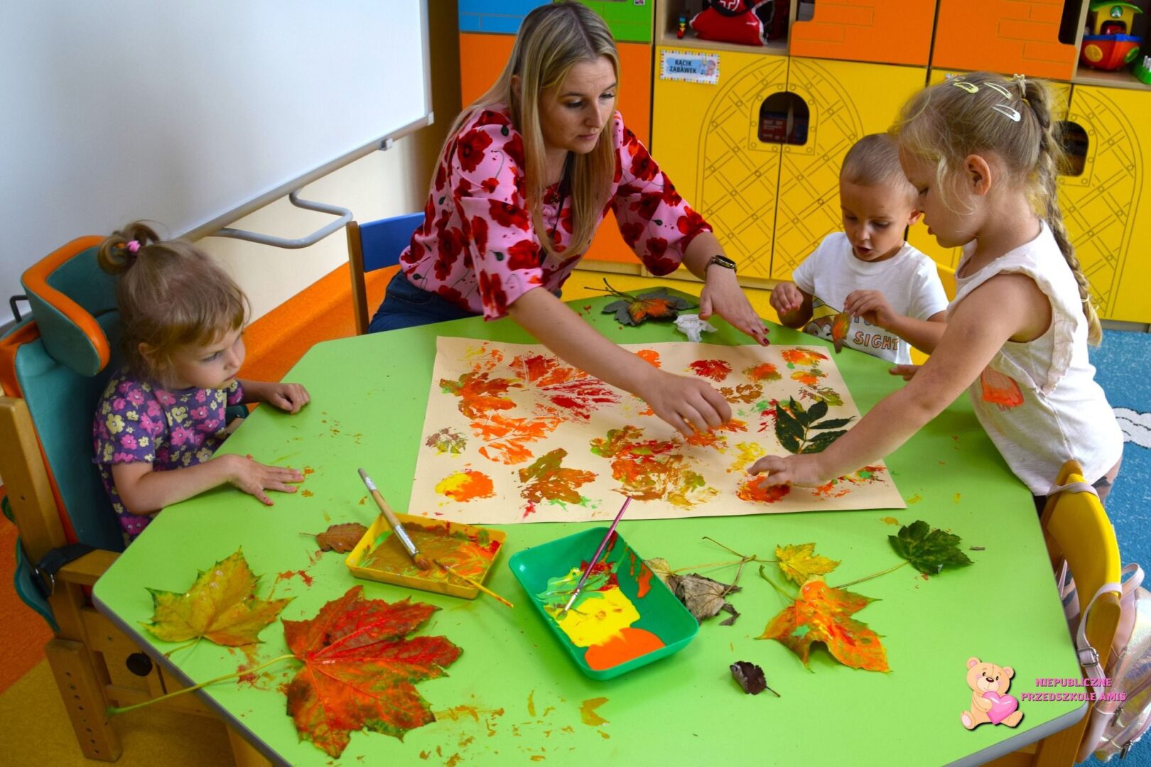 . Każdy dzień przynosił nowe doświadczenia, które łączyły zabawę z nauką i rozwijaniem wyobraźni. Podczas zabawy sensorycznej z zawiązanymi oczami, dzieci starały się rozpoznawać jesienną pogodę. Malowaliśmy liście farbami i odciskaliśmy je na wspólnym kartonie. Wykorzystywaliśmy kolorowe liście do zabaw matematycznych. Dzieci przeliczały, porównywały i segregowały. Wybraliśmy się też na pierwszy jesienny spacer, na którym obserwowaliśmy zmiany zachodzące w przyrodzie.