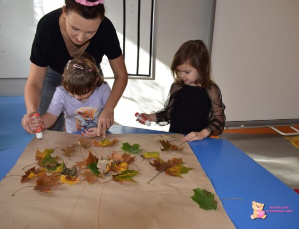W tym tygodniu przedszkolaki z grupy Promyczków wybrały się na spacer w poszukiwaniu jesieni. Podczas spaceru Amisiaki zbierały kolorowe liście i kasztany, które wykorzystały podczas zajęć. Ćwicząc motorykę małą dzieci wieszały liście na sznurku za pomocą klamerek, następnie powstało jesienne drzewo poprzez przyklejanie liści do korony drzew, a także kolorowy parasol wyklejony plasteliną.