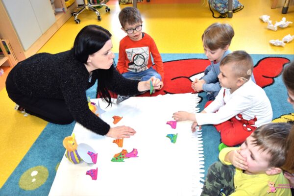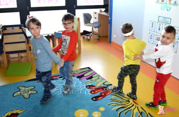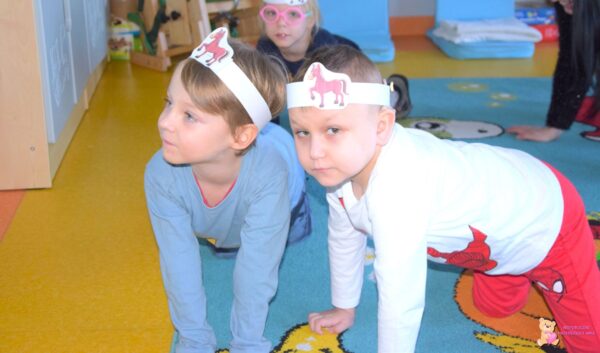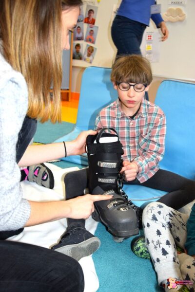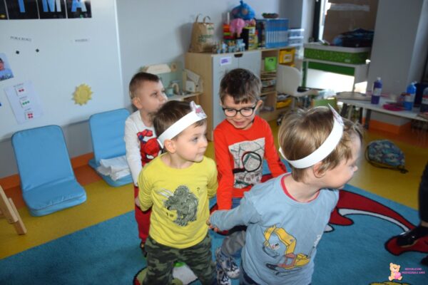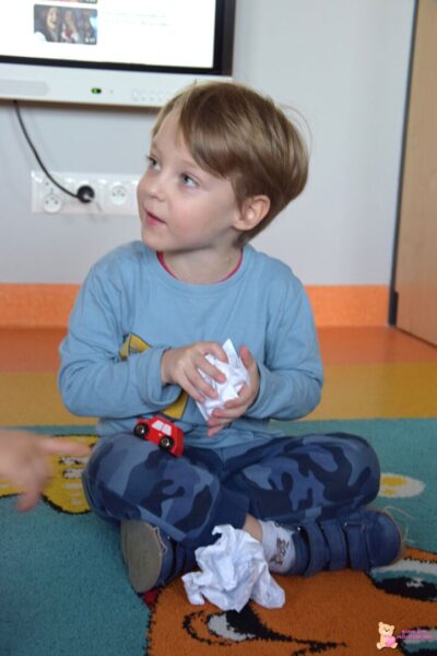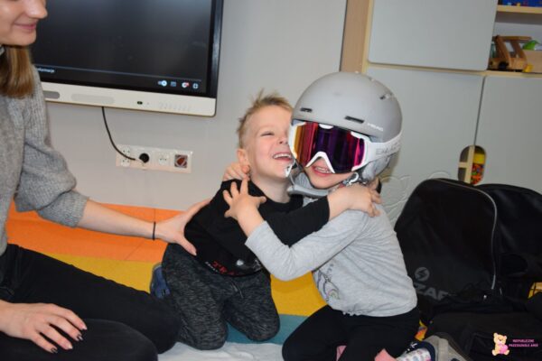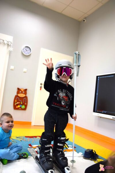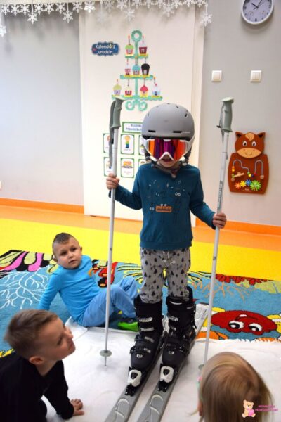 Rozmawialiśmy o tym, jakie sporty można uprawiać zimą. Poznaliśmy narciarzy, łyżwiarzy, oglądaliśmy sprzęty sportowe jakich używają. Najciekawsi przymierzali łyżwy i buty, aby choć trochę poczuć jak to jest być sportowcem. Bawiliśmy się też w kulig, gdzie jedne z dziećmi były konikami, drugie saneczkami, szukaliśmy śnieżnych kulek, w których ukryte były niespodzianki, braliśmy udział w zawodach sportowych. Pozostając w tematyce zimowej ćwiczyliśmy nasze główki, dopasowując łyżwy według kolorów, wzorków, łączyliśmy je w pary. Nie omieszkaliśmy się też nauczyć nawlekania sznurowadeł . Na zajęciach plastycznych malowaliśmy sanki.