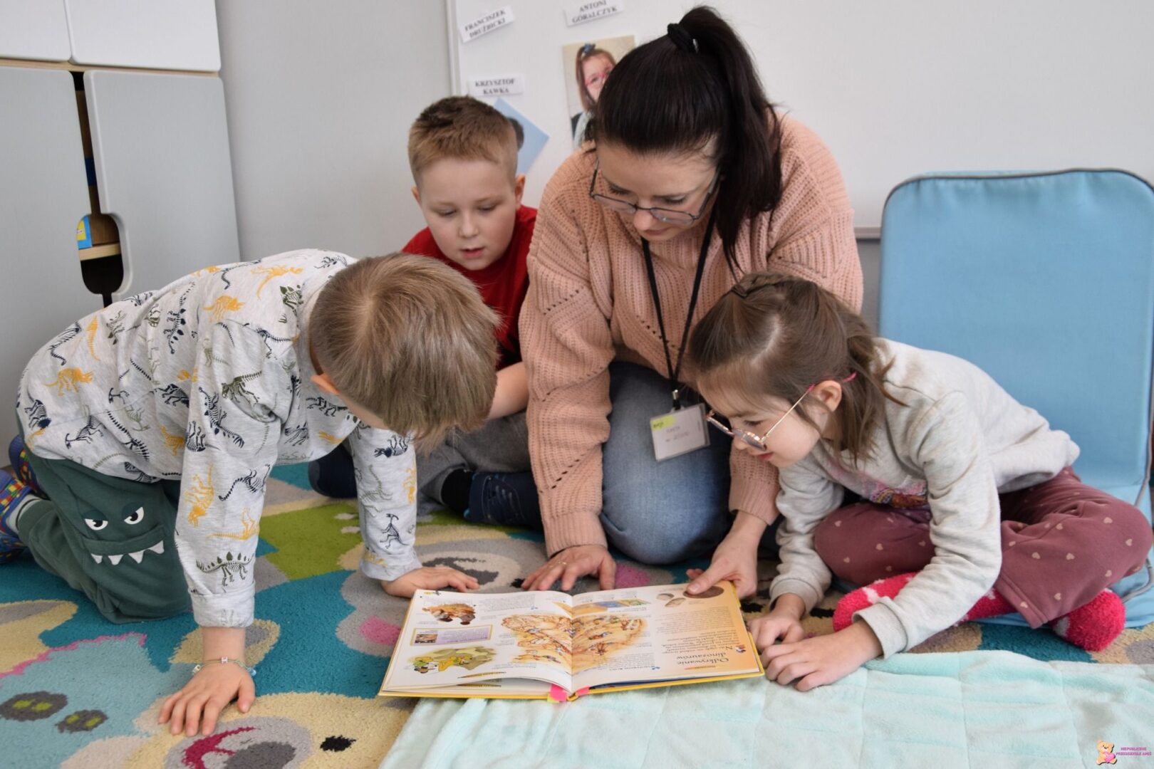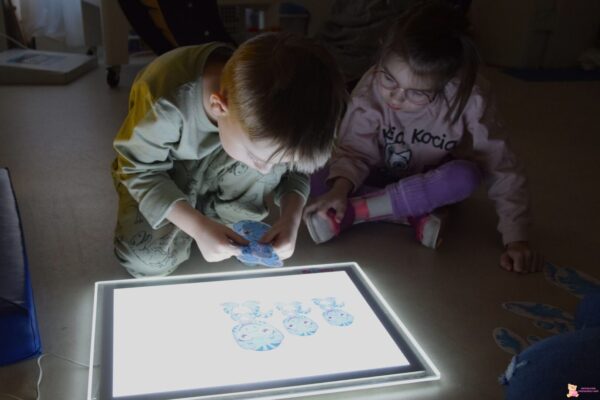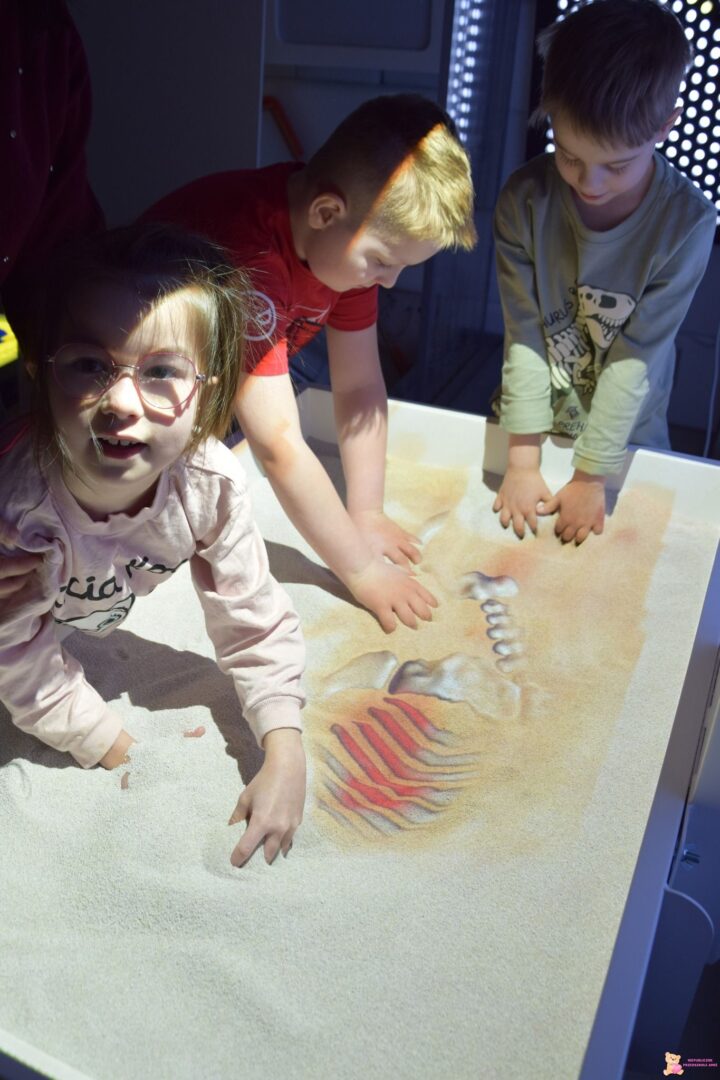 Ciocia przeczytała dzieciom bardzo ciekawą książkę o prehistorycznych gadach, dzięki której przedszkolaki mogły dowiedzieć się, jak wyglądały i jak żyły te niezwykłe stworzenia. Wykonały także pracę plastyczną – wypychały sylwety dinozaurów i naklejały je na kartkę, tworząc własne, kolorowe kompozycje. Na zakończenie tygodnia udaliśmy się do Sali Doświadczania Świata, gdzie dzieci wcieliły się w rolę małych paleontologów. W sensorycznej piaskownicy odkopywały kości dinozaura, a następnie układały dinozaury od najmniejszego do największego na podświetlanej tablicy ![]()