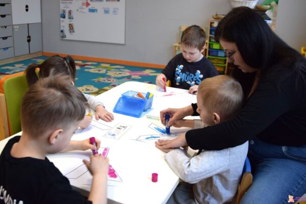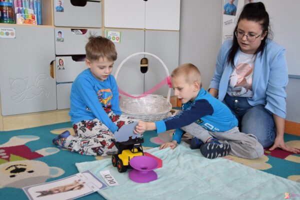 . Na początku dzieci utrwalały wiadomości o zwierzętach, które możemy hodować w domu oraz poznały pojęcia „mały” i „duży”, segregując plansze ze zwierzętami domowymi oraz różnymi przedmiotami według ich wielkości. Przedszkolaki poznały również literkę „Y”. Malowały jej kontur farbami w sztyfcie, a następnie ozdabiały brokatem