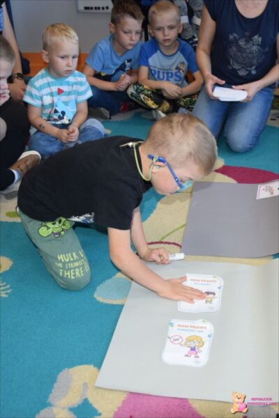chustą animacyjną, a także pokonywały tor przeszkód. Przypomniały sobie jakie mają prawa, przyklejając obrazki do wspólnie zrobionego plakatu. Potwierdzając swoją zgodę dotyczącą praw na plakacie odbiły paluszki