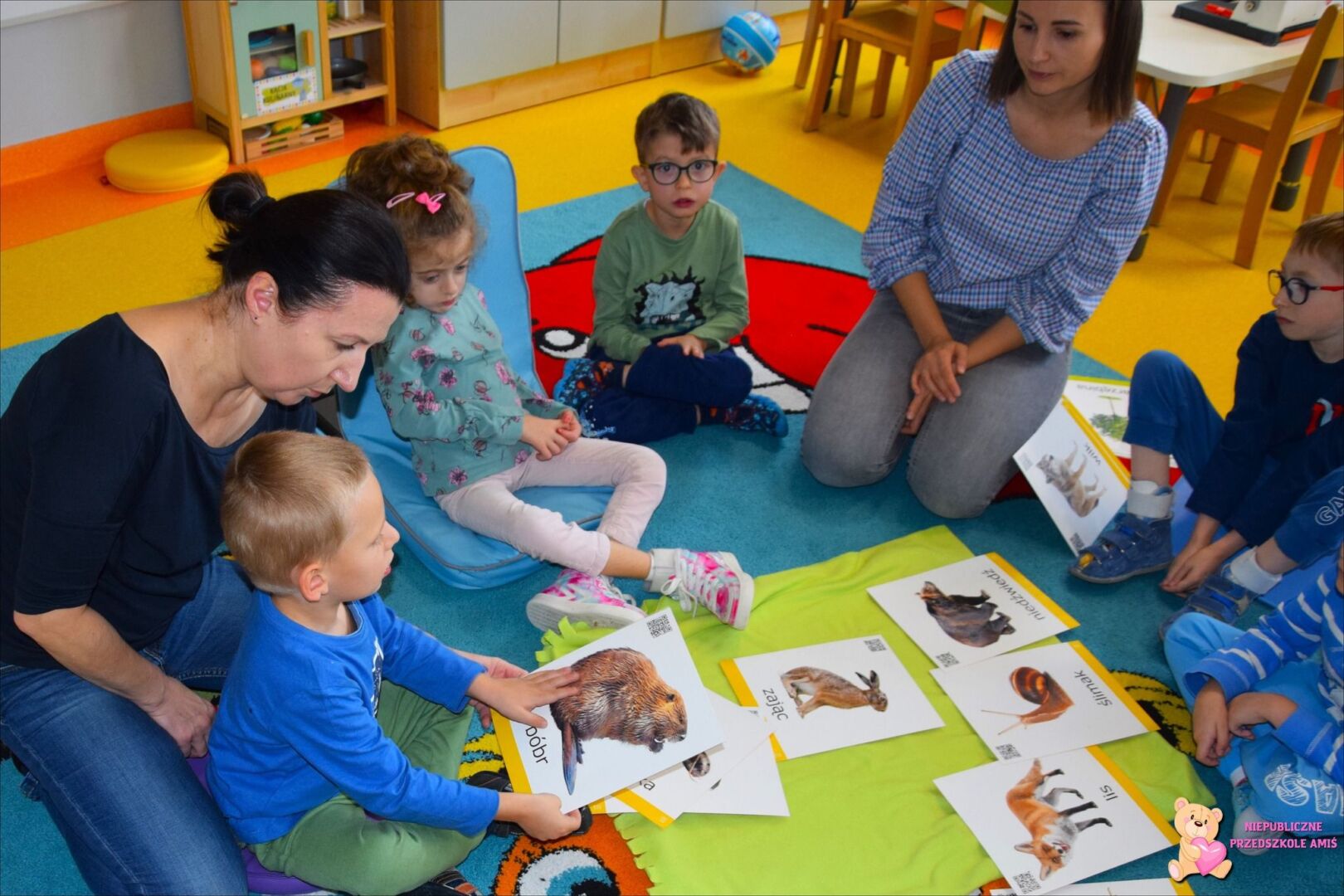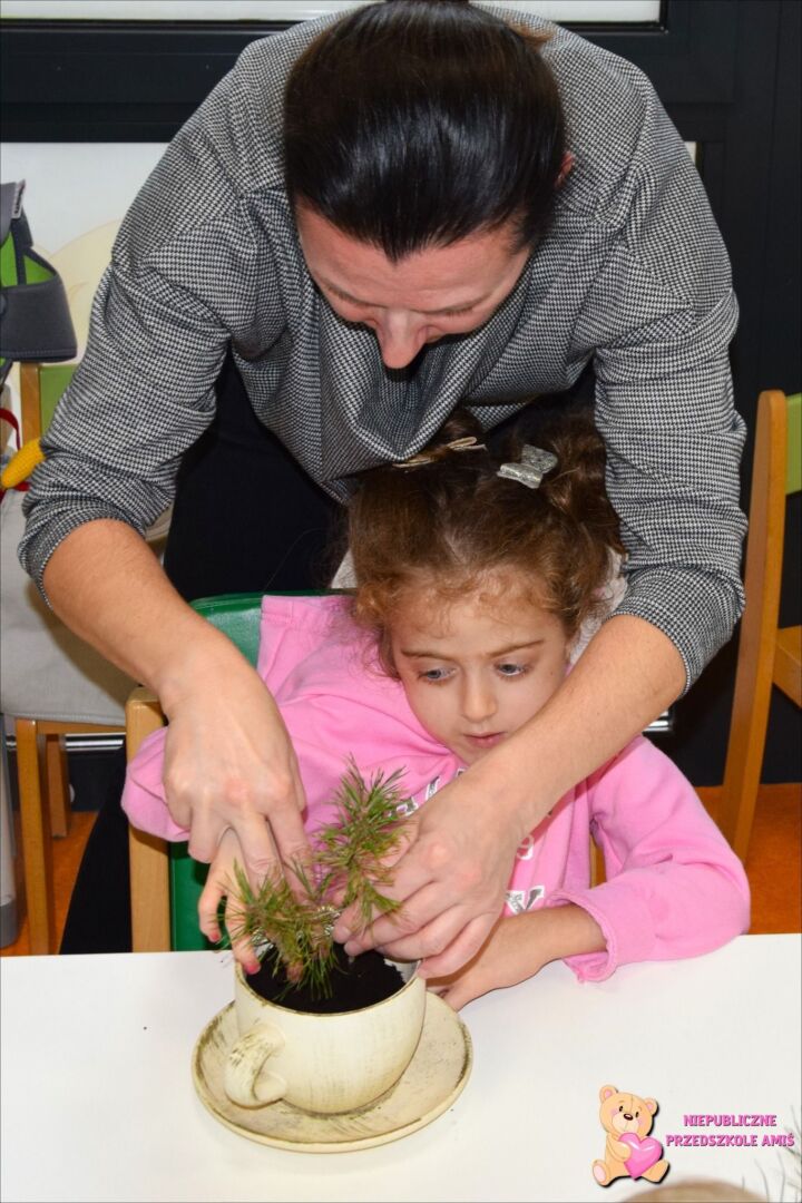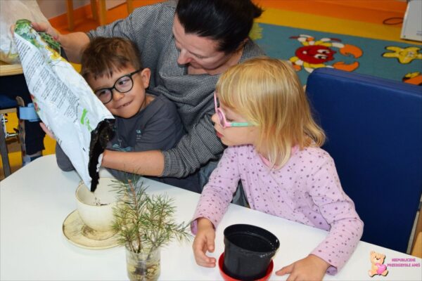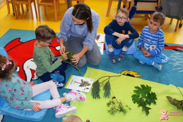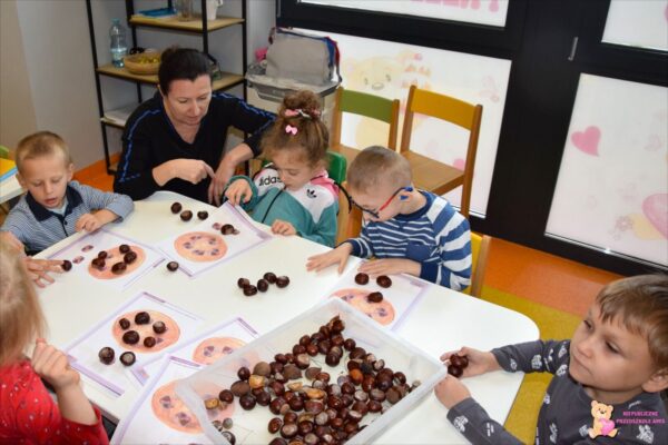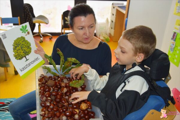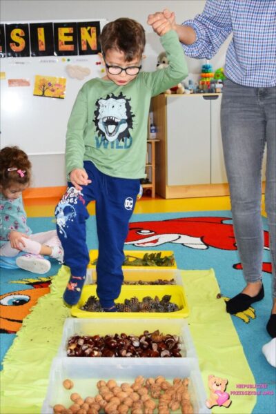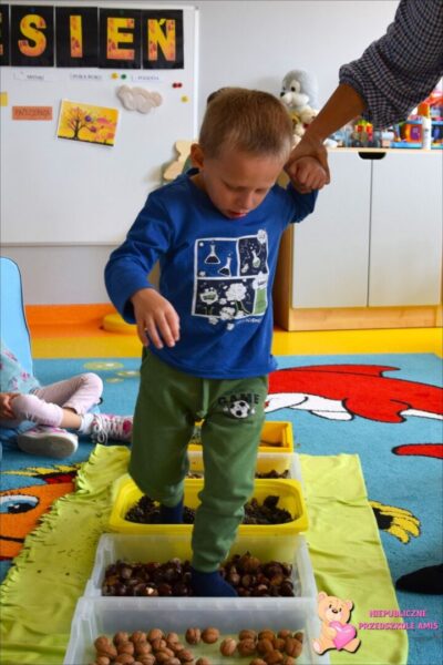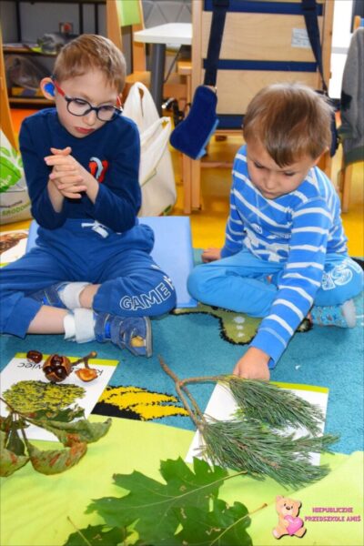 W tym tygodniu przedszkolacy z grupy Żabek 🐸przenieśli się w magiczny i kolorowy świat Pani Jesieni. Była to barwna przygoda, która wymagała od naszych dzielnych Amisiaków zaangażowania i ciężkiej pracy. Dzieci poznały zwierzęta, które mieszkają w parkach i lasach🦊🐿🦆. Wskazywały i nazywały je na obrazkach, a następnie sprawdziły swoje umiejętności słuchowe rozpoznając zwierzęta, po wydawanych przez nie odgłosach. Po utrwaleniu wiedzy na temat fauny przyszedł czas na poznanie flory. Przedszkolacy poznali drzewa, które występują w naszych lasach i parkach. Dopasowywali liście i owoce do danego drzewa. Ćwiczyli pamięć i myślenie przyczynowo-skutkowe układając rytmy. W tym tygodniu szczególnie ciężko pracowały rączki naszych Amisiaków . Dzieci segregowały dary jesieni: liście🍂🍁, orzechy, kasztany, żołędzie oraz szyszki. Wykonywały pracę plastyczną kolorując liście barwnikami za pomocą pipetek. Sadziły sadzonki świerka. Z łupin orzecha zrobiły łódeczki, biedronki🐞, owoce🍏, motyle🦋, co tylko podsunęła im wyobraźnia. Oczywiście nie zapomnieliśmy o pracy stóp🦶, które musiały przejść przez ścieżkę sensoryczną. A najfajniejsze było to, że przy tych wszystkich zadaniach dzieci świetnie się bawiły, śpiewając i interpretując ruchem jesienne piosenki.