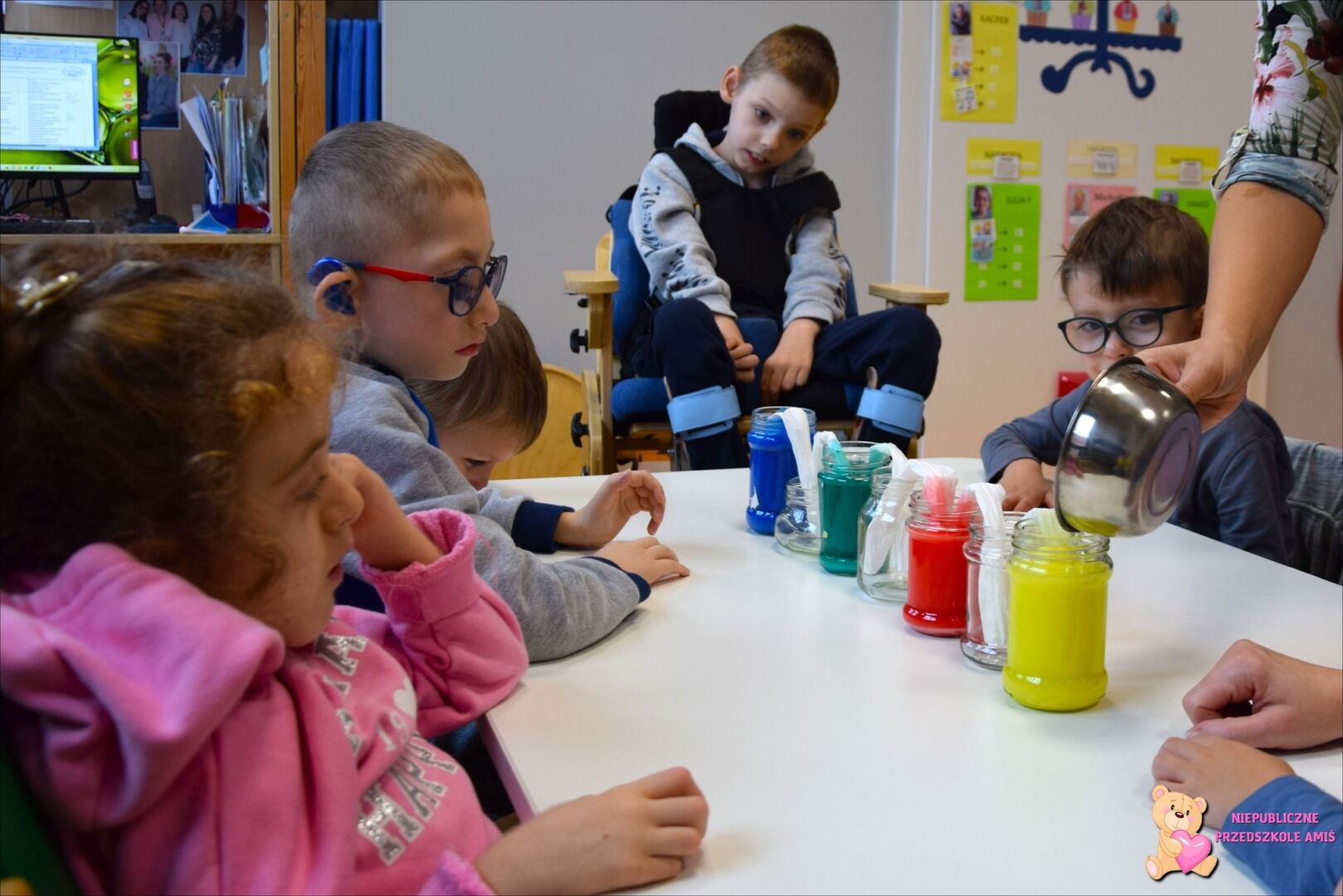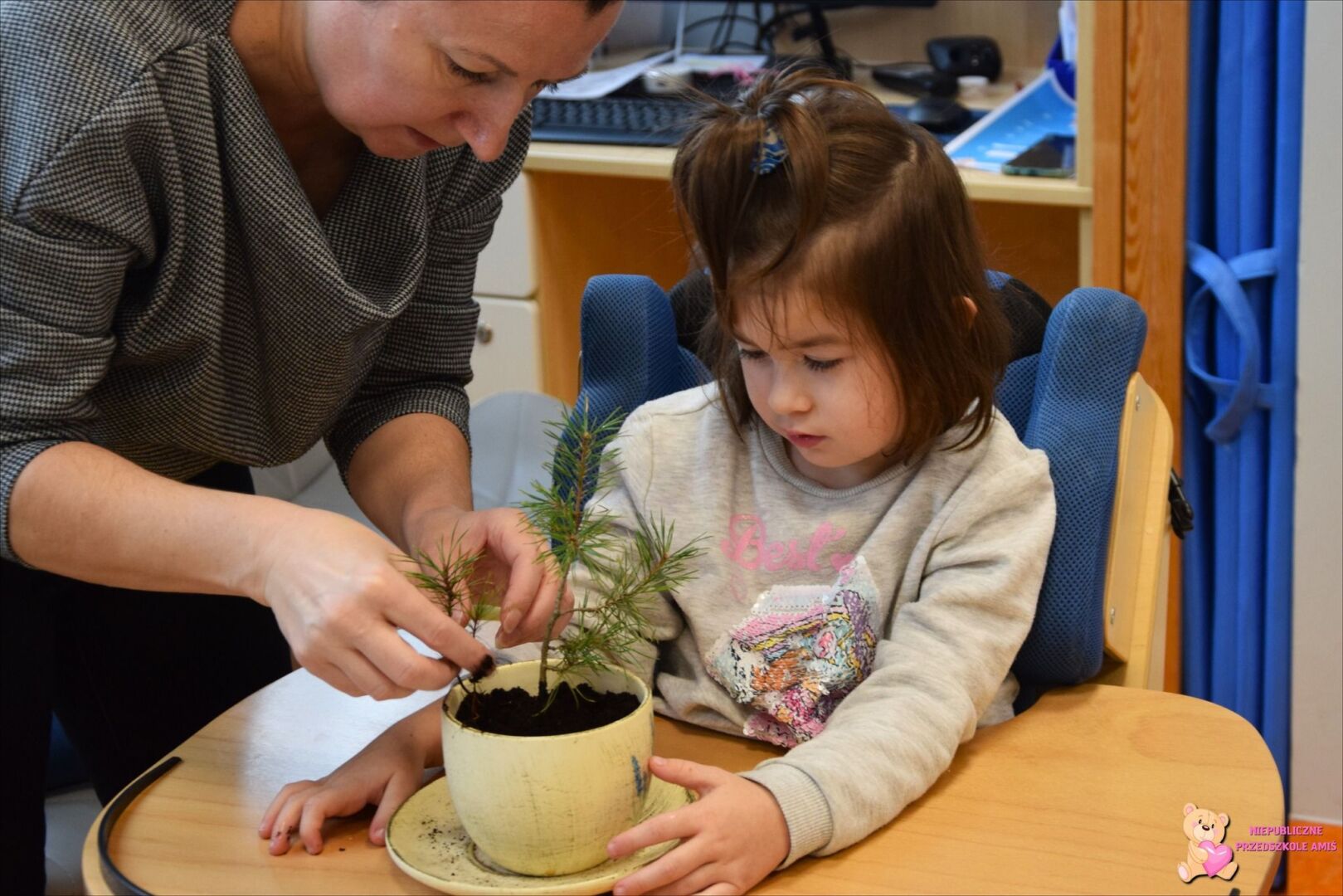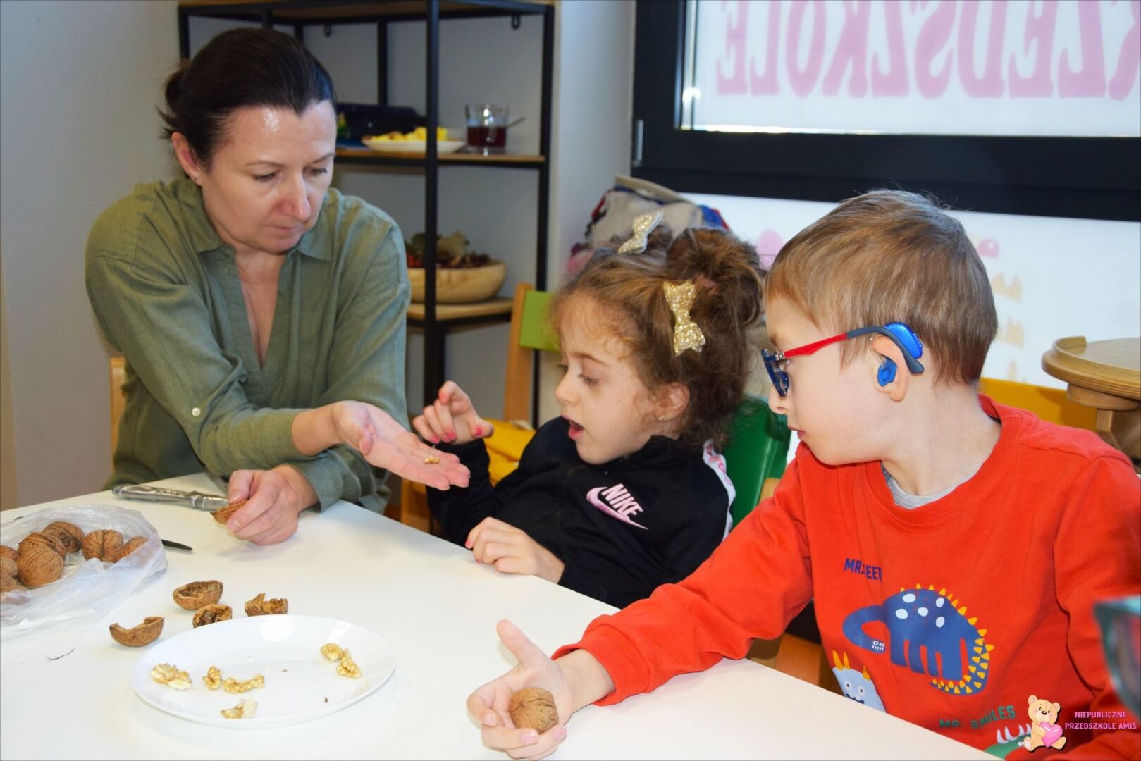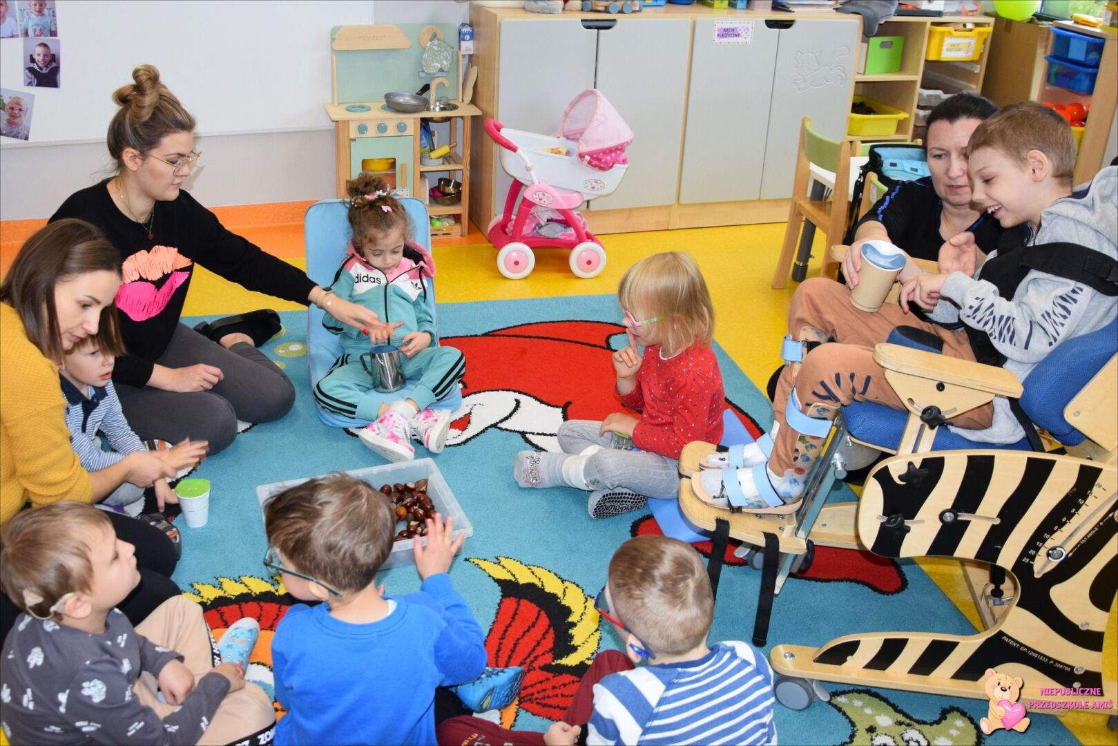 W tym tygodniu przedszkolacy z grupy Żabek 🐸przenieśli się w magiczny i kolorowy świat Pani Jesieni. Była to barwna przygoda, która wymagała od naszych dzielnych Amisiaków zaangażowania i ciężkiej pracy. Dzieci poznały zwierzęta, które mieszkają w parkach i lasach🦊🐿🦆. Wskazywały i nazywały je na obrazkach, a następnie sprawdziły swoje umiejętności słuchowe rozpoznając zwierzęta, po wydawanych przez nie odgłosach. Po utrwaleniu wiedzy na temat fauny przyszedł czas na poznanie flory. Przedszkolacy poznali drzewa, które występują w naszych lasach i parkach. Dopasowywali liście i owoce do danego drzewa. Ćwiczyli pamięć i myślenie przyczynowo-skutkowe układając rytmy. W tym tygodniu szczególnie ciężko pracowały rączki naszych Amisiaków . Dzieci segregowały dary jesieni: liście🍂🍁, orzechy, kasztany, żołędzie oraz szyszki. Wykonywały pracę plastyczną kolorując liście barwnikami za pomocą pipetek. Sadziły sadzonki świerka. Z łupin orzecha zrobiły łódeczki, biedronki🐞, owoce🍏, motyle🦋, co tylko podsunęła im wyobraźnia. Oczywiście nie zapomnieliśmy o pracy stóp🦶, które musiały przejść przez ścieżkę sensoryczną. A najfajniejsze było to, że przy tych wszystkich zadaniach dzieci świetnie się bawiły, śpiewając i interpretując ruchem jesienne piosenki.