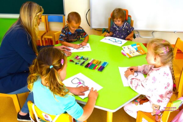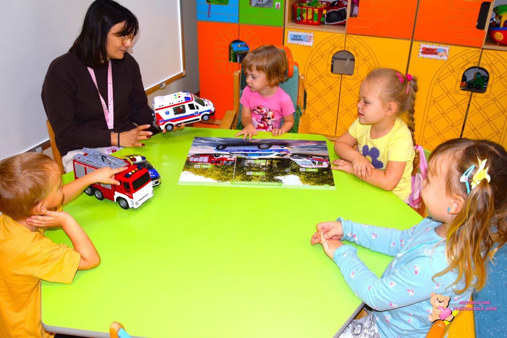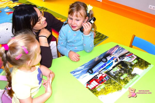 Dzieci poznały również Piramidę Żywienia , dzięki której zrozumiały, co pomaga im rosnąć zdrowo i mieć dużo energii. Rozmawialiśmy też o tym, jak dbać o wzrok👀 – dzieci dowiedziały się, dlaczego niektórzy noszą okulary👓 i jak chronić swoje oczy. Na zakończenie każdy przedszkolak wykleił plasteliną własne, kolorowe oprawki okularów – było dużo radości, kreatywności i zabawy! Dodatkowo dzieci poznały służby ratunkowe – straż pożarną🚒, policję🚓 i pogotowie🚑 – oraz nauczyły się, jak i kiedy korzystać z numeru alarmowego 112.