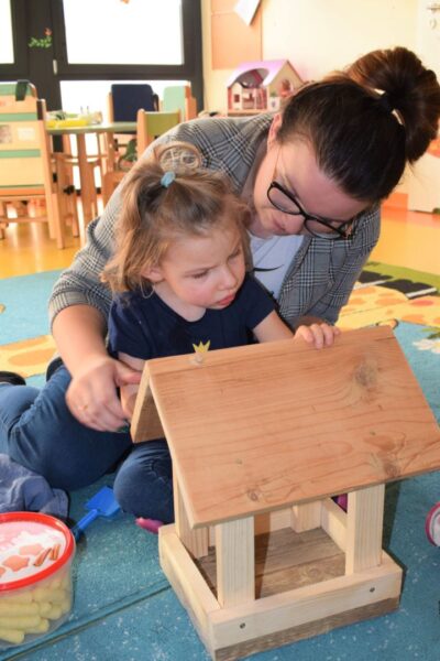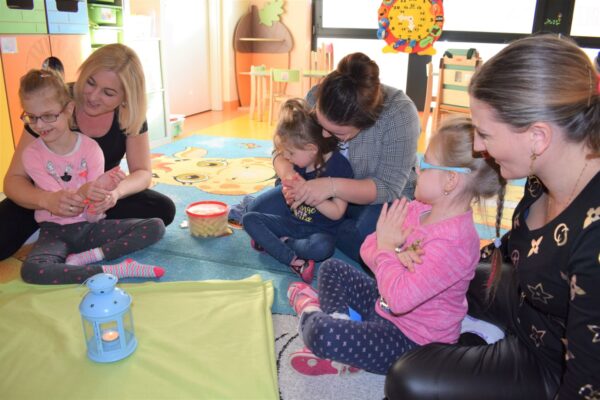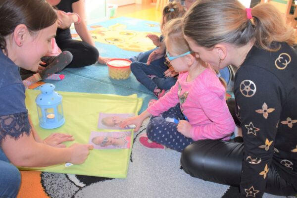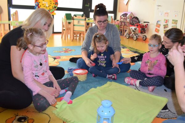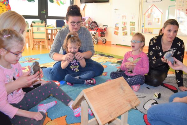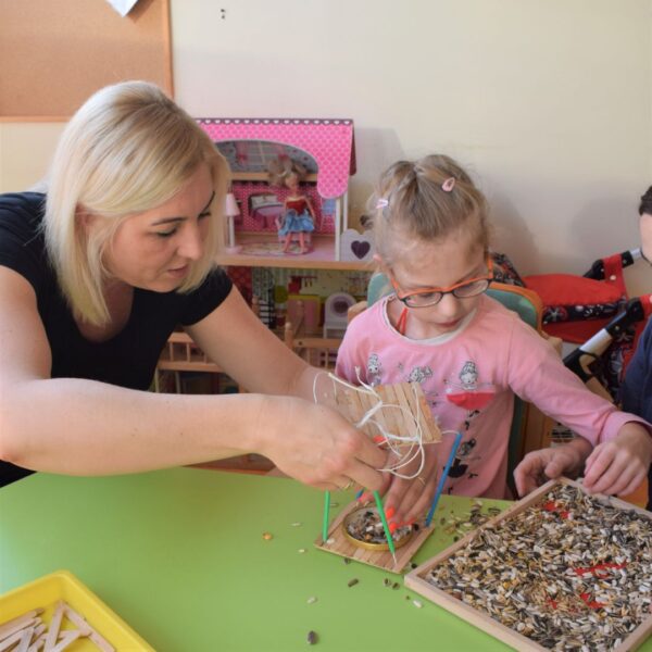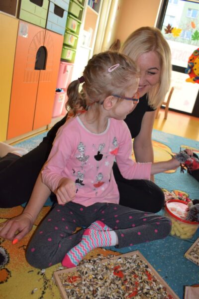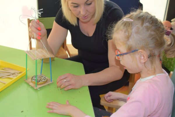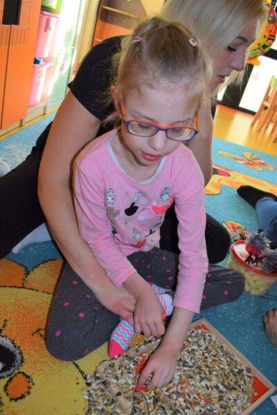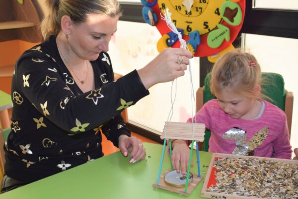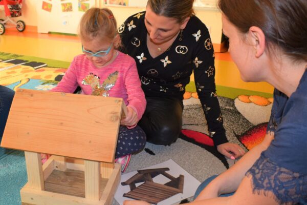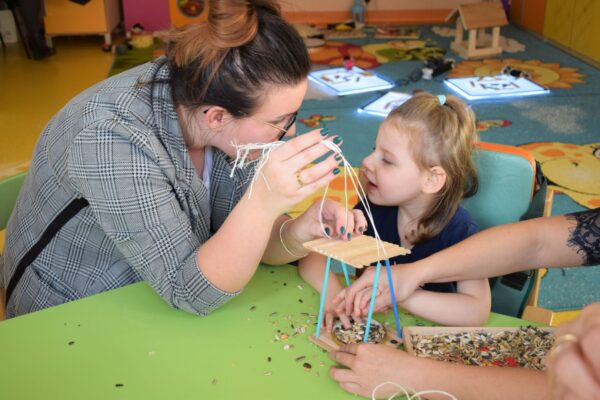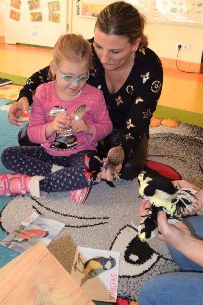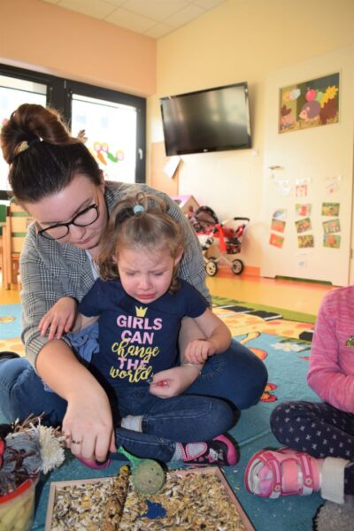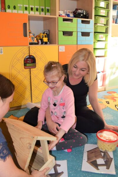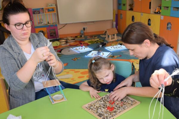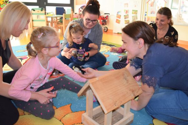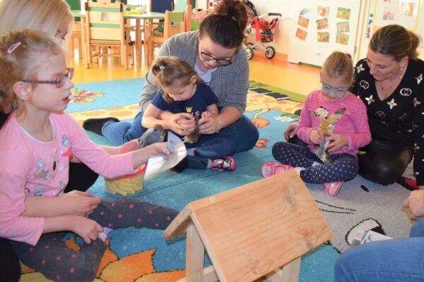 Dziewczynki z grupy Myszek zrobiły karmnik dla ptaków z pomocą swoich mam. Zajęcia rozpoczęły się porannym kręgiem, powitalną piosenką i dzieci wybierały swoje zdjęcie oraz wskazywały właściwą porę roku. Tematem dzisiejszych zajęć dydaktycznych było poznanie „Kto przyleci do karmnika?” Dziewczynki polisensorycznie poznały domek dla ptaków, różnice między wróblem, gilem i sikorką, odsłuchiwały ich głosy oraz zaznajamiały się z ich przysmakami. Dowiedziały się, iż ptaki, które zostają na zimę należy pomóc, dokarmiając je, wsypując ziarenka do karmnika. Aby mamy i ich dzieci mogły się zrelaksować, wprowadziłyśmy zabawy muzyczno-ruchowe. Pierwsze ćwiczenie na rozgrzewkę była zabawa paluszkowa. Do tekstu pt.: „Sowa” dzieci starały się z pomocą mam naśladować ruchy dłońmi, odlatujące ptaki i przylatujące. Przy tym ćwiczeniu bardzo ważne było, aby mamy mogły uściskać swoje dziecko, okazując mu ciepło i miłość, przytulając je do siebie. Następna zabawa to „Ptaszki do karmnika”, przy akompaniamencie tamburynu mamy poruszały się naśladując fruwające ptaki, a dzieci wystukiwały paluszkami w tamburyn wskazując powrót ich mam. Radość przy tej zabawie była ogromna, mamy się odprężyły i wyluzowały. Kolejnym zadaniem była zabawa archeologiczna, czyli odkopywanie obrazka ptaszka spod piasku z pomocą rodzica i umieszczanie ich na zbudowanym karmniku na tablicy podświetlanej. Na zakończenie trzeba było zbudować karmnik dla ptaków. Mamy z dziećmi pracowicie zabrały się do wykonania zadania. Miło jest na zajęciach otwartych, przebiegły one w przyjaznej atmosferze, w gronie ciepłym i rodzinnym.