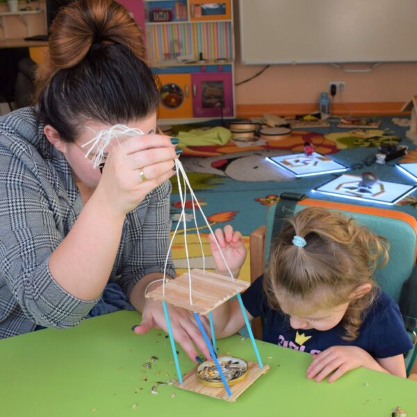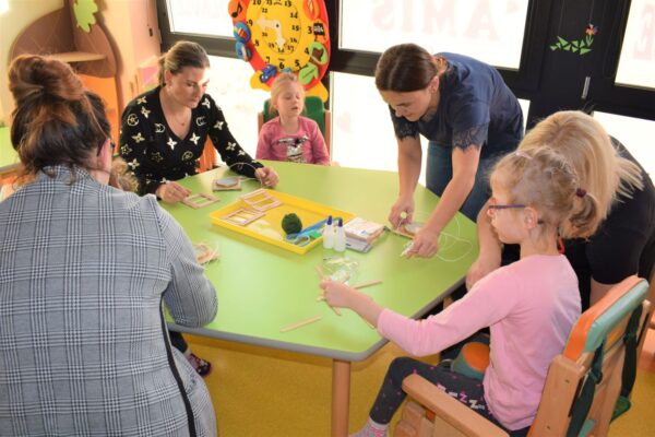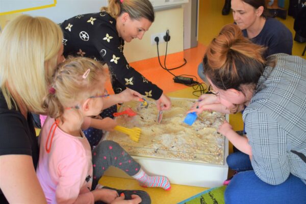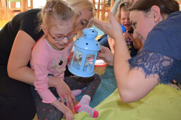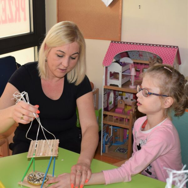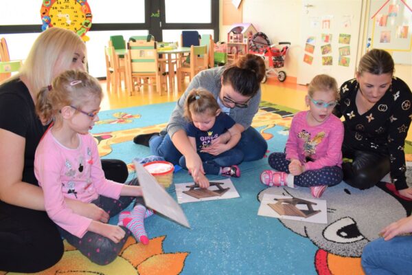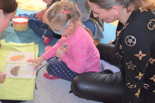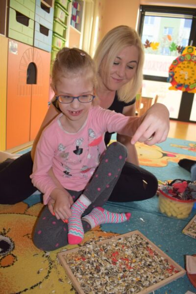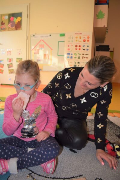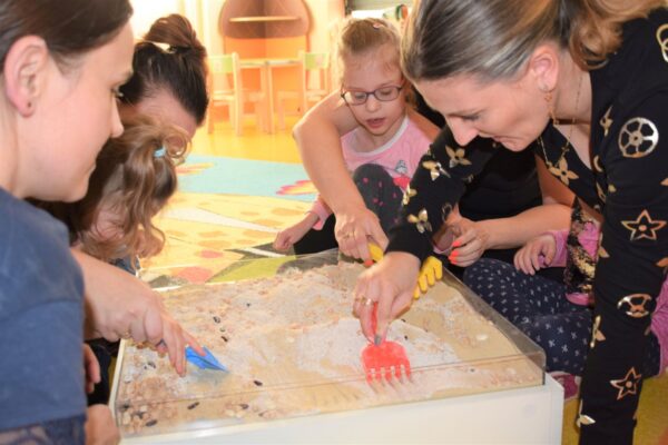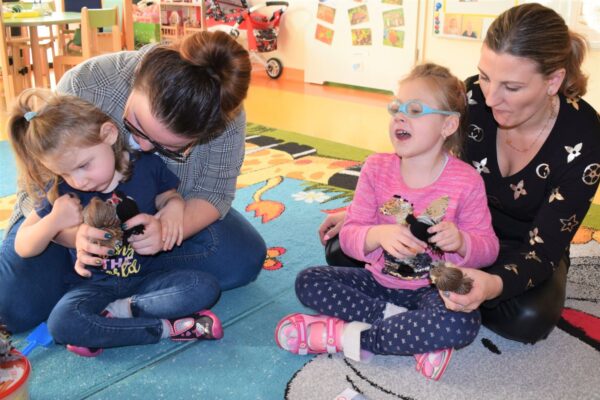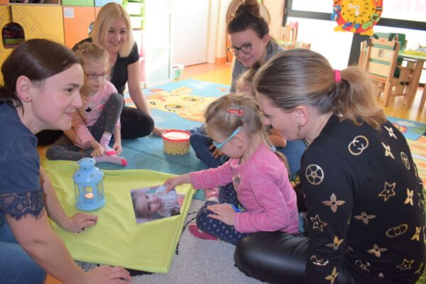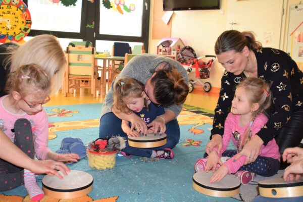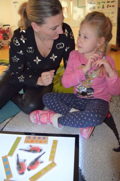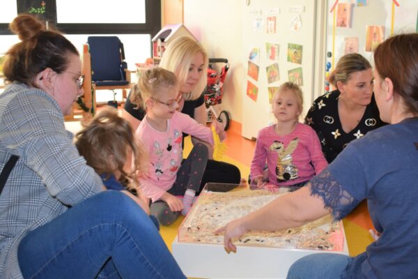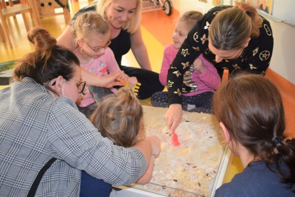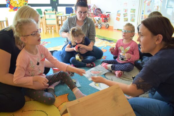 Dziewczynki z grupy Myszek zrobiły karmnik dla ptaków z pomocą swoich mam. Zajęcia rozpoczęły się porannym kręgiem, powitalną piosenką i dzieci wybierały swoje zdjęcie oraz wskazywały właściwą porę roku. Tematem dzisiejszych zajęć dydaktycznych było poznanie „Kto przyleci do karmnika?” Dziewczynki polisensorycznie poznały domek dla ptaków, różnice między wróblem, gilem i sikorką, odsłuchiwały ich głosy oraz zaznajamiały się z ich przysmakami. Dowiedziały się, iż ptaki, które zostają na zimę należy pomóc, dokarmiając je, wsypując ziarenka do karmnika. Aby mamy i ich dzieci mogły się zrelaksować, wprowadziłyśmy zabawy muzyczno-ruchowe. Pierwsze ćwiczenie na rozgrzewkę była zabawa paluszkowa. Do tekstu pt.: „Sowa” dzieci starały się z pomocą mam naśladować ruchy dłońmi, odlatujące ptaki i przylatujące. Przy tym ćwiczeniu bardzo ważne było, aby mamy mogły uściskać swoje dziecko, okazując mu ciepło i miłość, przytulając je do siebie. Następna zabawa to „Ptaszki do karmnika”, przy akompaniamencie tamburynu mamy poruszały się naśladując fruwające ptaki, a dzieci wystukiwały paluszkami w tamburyn wskazując powrót ich mam. Radość przy tej zabawie była ogromna, mamy się odprężyły i wyluzowały. Kolejnym zadaniem była zabawa archeologiczna, czyli odkopywanie obrazka ptaszka spod piasku z pomocą rodzica i umieszczanie ich na zbudowanym karmniku na tablicy podświetlanej. Na zakończenie trzeba było zbudować karmnik dla ptaków. Mamy z dziećmi pracowicie zabrały się do wykonania zadania. Miło jest na zajęciach otwartych, przebiegły one w przyjaznej atmosferze, w gronie ciepłym i rodzinnym.