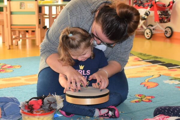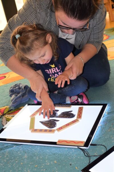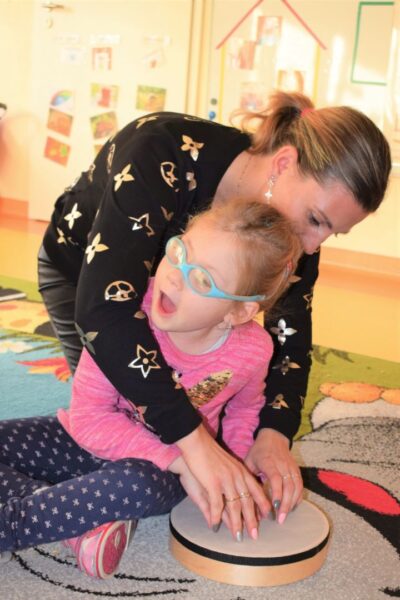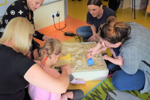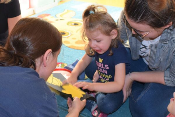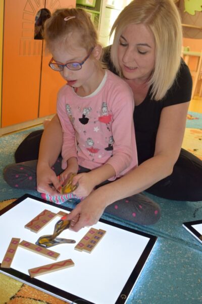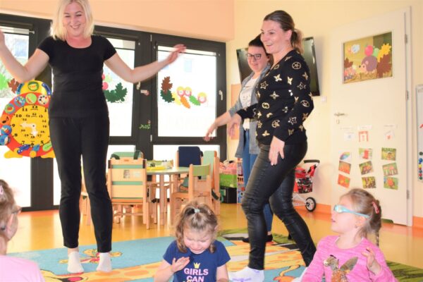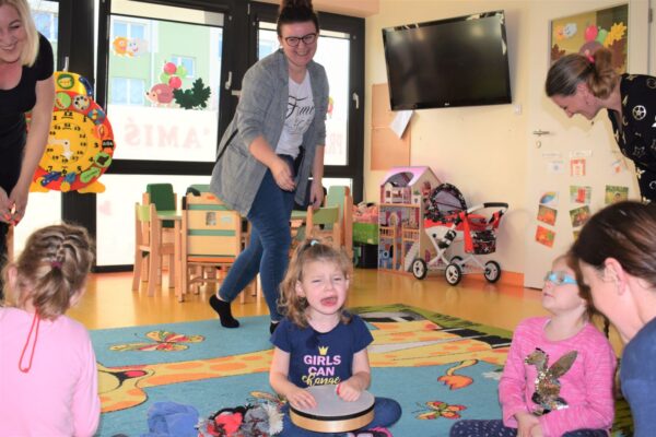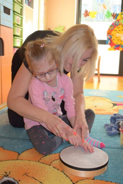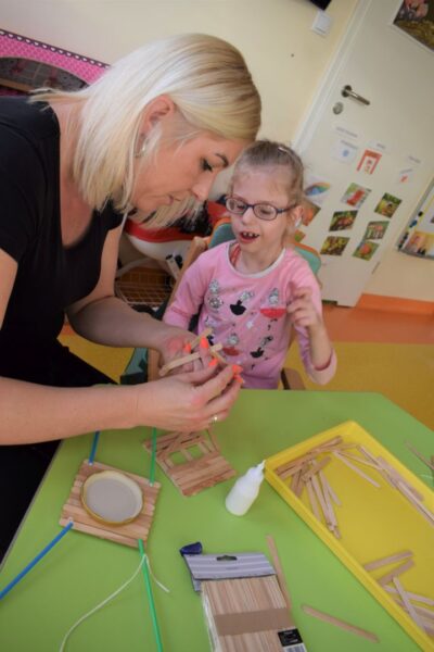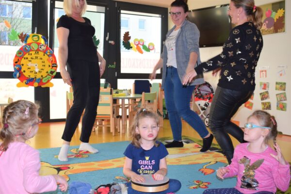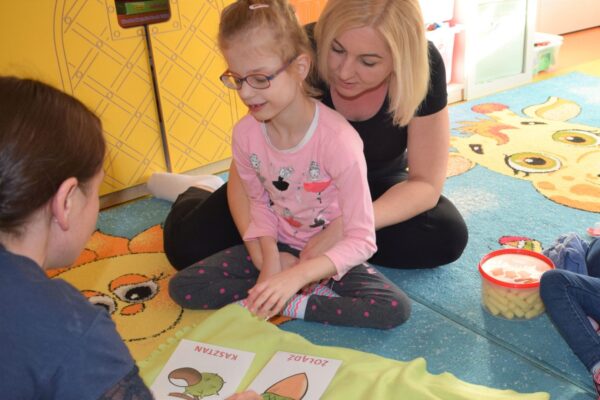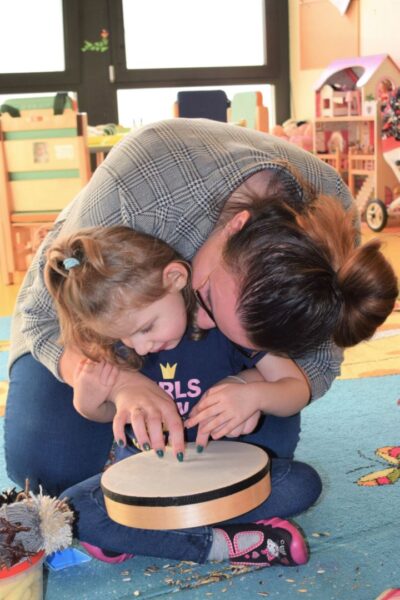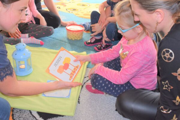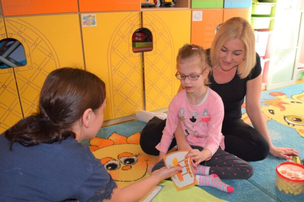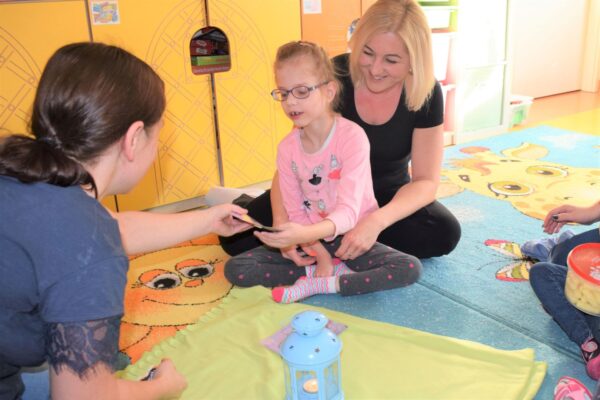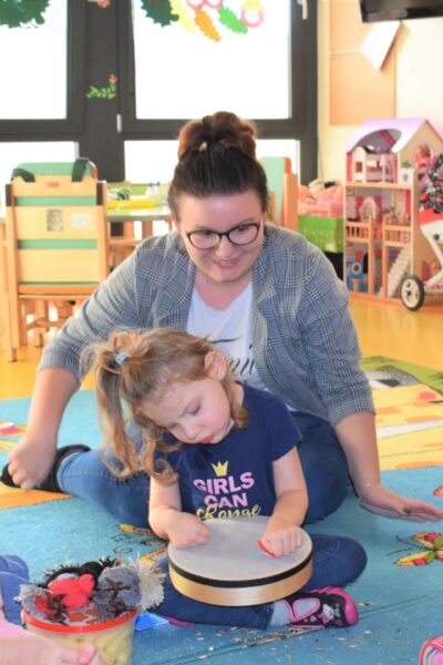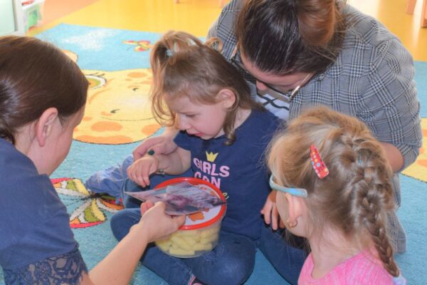 Dziewczynki z grupy Myszek zrobiły karmnik dla ptaków z pomocą swoich mam. Zajęcia rozpoczęły się porannym kręgiem, powitalną piosenką i dzieci wybierały swoje zdjęcie oraz wskazywały właściwą porę roku. Tematem dzisiejszych zajęć dydaktycznych było poznanie „Kto przyleci do karmnika?” Dziewczynki polisensorycznie poznały domek dla ptaków, różnice między wróblem, gilem i sikorką, odsłuchiwały ich głosy oraz zaznajamiały się z ich przysmakami. Dowiedziały się, iż ptaki, które zostają na zimę należy pomóc, dokarmiając je, wsypując ziarenka do karmnika. Aby mamy i ich dzieci mogły się zrelaksować, wprowadziłyśmy zabawy muzyczno-ruchowe. Pierwsze ćwiczenie na rozgrzewkę była zabawa paluszkowa. Do tekstu pt.: „Sowa” dzieci starały się z pomocą mam naśladować ruchy dłońmi, odlatujące ptaki i przylatujące. Przy tym ćwiczeniu bardzo ważne było, aby mamy mogły uściskać swoje dziecko, okazując mu ciepło i miłość, przytulając je do siebie. Następna zabawa to „Ptaszki do karmnika”, przy akompaniamencie tamburynu mamy poruszały się naśladując fruwające ptaki, a dzieci wystukiwały paluszkami w tamburyn wskazując powrót ich mam. Radość przy tej zabawie była ogromna, mamy się odprężyły i wyluzowały. Kolejnym zadaniem była zabawa archeologiczna, czyli odkopywanie obrazka ptaszka spod piasku z pomocą rodzica i umieszczanie ich na zbudowanym karmniku na tablicy podświetlanej. Na zakończenie trzeba było zbudować karmnik dla ptaków. Mamy z dziećmi pracowicie zabrały się do wykonania zadania. Miło jest na zajęciach otwartych, przebiegły one w przyjaznej atmosferze, w gronie ciepłym i rodzinnym.