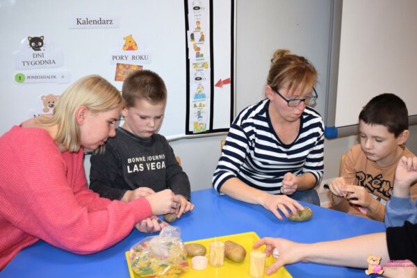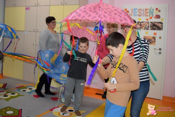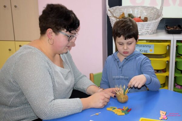 Wczoraj w grupie „Zajączków” odbyły się dni otwarte dla rodziców o tematyce przewodniej „Dary Jesieni”🍂. Dzieci wraz z rodzicami rozpoczęli go od wspólnego przywitania się 👋 Podczas porannego kręgu, dzieci mówiły swoje imię i nazwisko, wiek oraz adres zamieszkania, a następnie razem ustalili dzień tygodnia, miesiąc, porę roku oraz pogodę🌦. Przedszkolaki przypomnieli sobie dary jesieni🍁, a następnie dopasowywali je do odpowiednich obrazków. Po skończonym zadaniu pełni energii, ruszyli na poszukiwania leśnych mieszkańców🐗, którzy ukryli się w sali. Każde dziecko literowało nazwy odkrytych zwierząt, doskonaląc swoje umiejętności rozpoznawania liter. Kolejnym punktem wydarzenia były zabawy muzyczno-ruchowe, podczas których dzieci wraz z rodzicami poruszali się w rytm muzyki z kolorowymi parasolami🌂. Na zakończenie wspólnej zabawy rodzice i dzieci spędzili czas na twórczej pracy, tworząc jeża 🦔z ziemniaka, wykałaczek i makaronu. Jeszcze raz dziękujemy wszystkim za wspólnie spędzony czas i zaangażowanie w zajęcia.😃