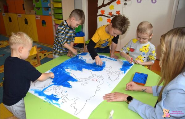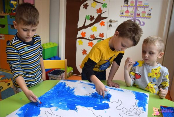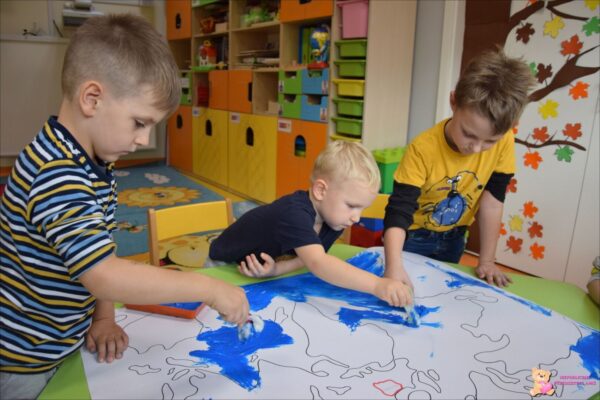 Chłopcy poznali znaczenie określeń mała i duża ojczyzna. Oglądali mapę Polski, dowiedzieli się, jak wyglądają góry, morze i rzeki przedstawione na mapie. Poznali też położenie stolicy naszego kraju oraz miast, w których mieszkają. Obejrzeli też model Ziemi- globus, który sprawił im wiele frajdy. Dowiedzieli się, jakimi kolorami oznaczone są wody i lądy. Wykonali pracę plastyczną- mapę świata, malując ją przy pomocy waty i klamerek do prania. Rozmawialiśmy także o tym, co wchodzi w skład naszej małej ojczyzny. Każdy z chłopców potrafi przedstawić się, powiedzieć, w jakiej miejscowości i kraju mieszka oraz co jest stolicą naszego kraju. Poznali także nowe literki. Tydzień ten obfitował także w ciekawe zabawy swobodne i konstrukcyjne, które są niezwykle ważne dla rozwoju społecznego i poznawczego dzieci.