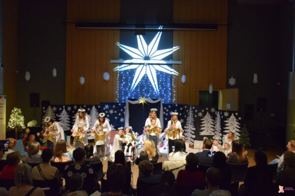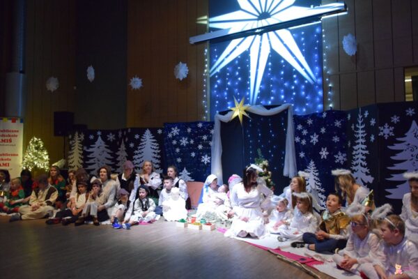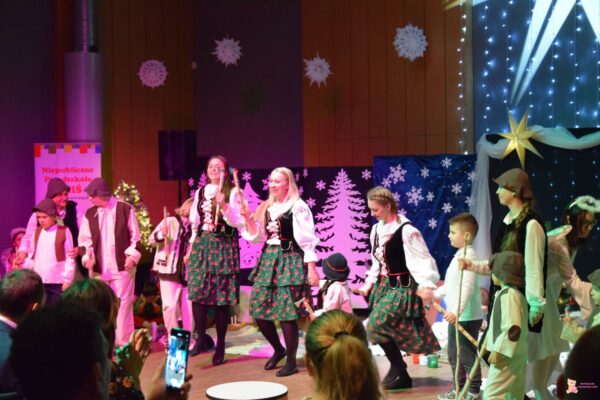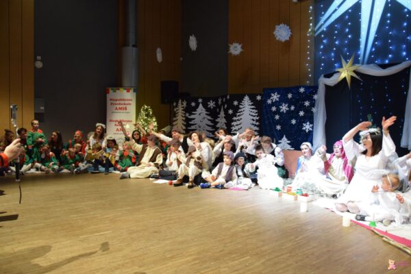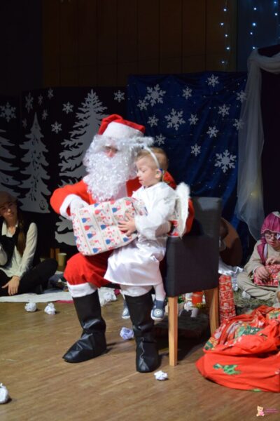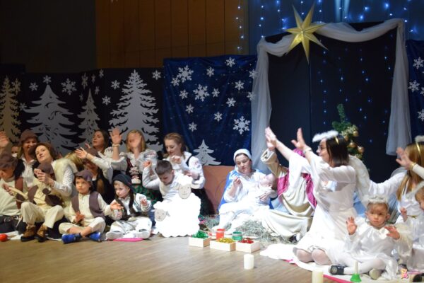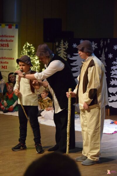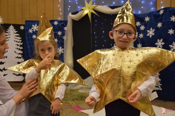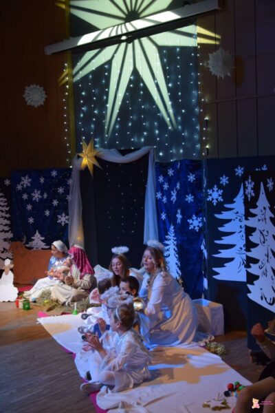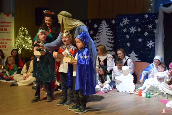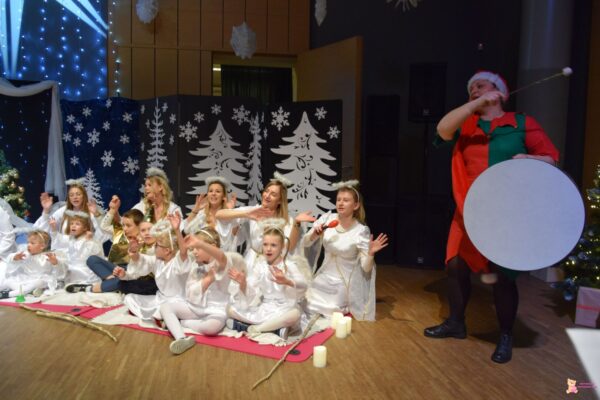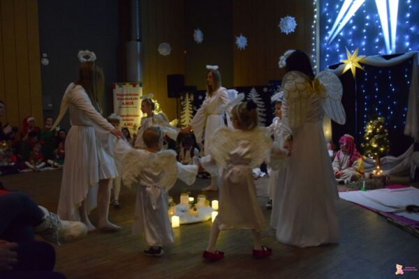 Świąteczny nastrój podkreślały niecodzienne stroje dzieci, bożonarodzeniowa dekoracja sali, przedszkolaki na moment przestały być zwykłymi dziećmi i zmieniły się w najświętszą rodzinę, anioły, górali, góralki, pastuszków i elfów. Mali artyści z dużym przejęciem i zaangażowaniem wiernie odtwarzali swoje role, prezentowali umiejętności. Wszystkim przedszkolakom należą się ogromne pochwały za zaangażowanie. Recytowane wierszyki, kolędy i pastorałki, dzięki którym stworzyły wspaniałą, świąteczną atmosferę i podbiły serca całej widowni. Dziękujemy również rodzicom za współpracę i pomoc przy organizacji poczęstunku.