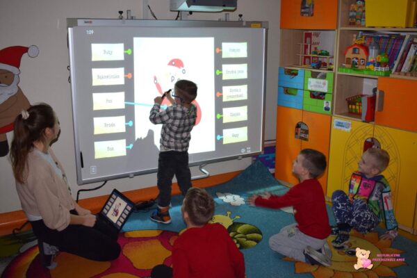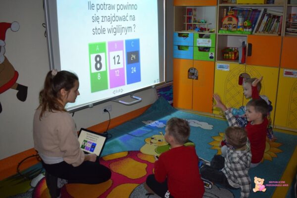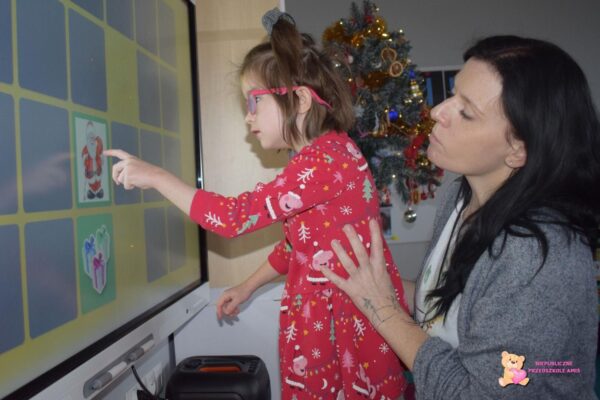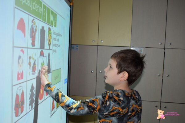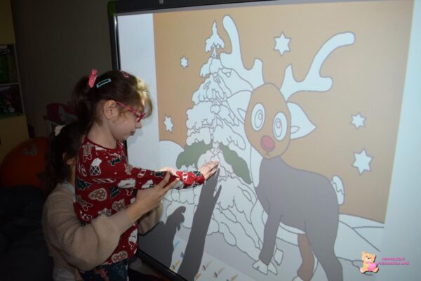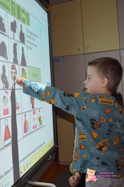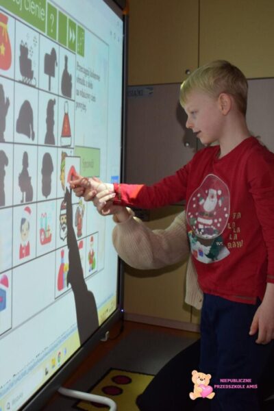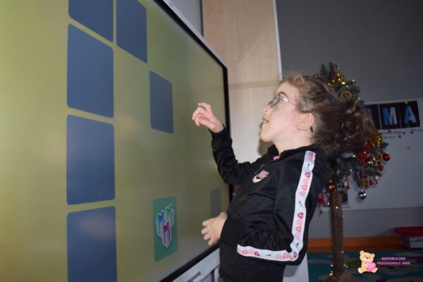 Podczas dzisiejszych zajęć z „Klik i umiem to w mig” dzieci miały okazję rozwijać swoje umiejętności poznawcze i językowe przy użyciu tablicy multimedialnej. Przedszkolaki rozwiązywały różnorodne gry edukacyjne, które wprowadziły je w magiczny klimat Świąt Bożego Narodzenia. W ramach zajęć rozwiązywali quiz, dopasowywali cienie do odpowiednich przedmiotów związanych z okresem świątecznym, wyszukiwali par przedmiotów w grze „memory” oraz kolorowali zimowe obrazki. Zajęcia z ćwiczeń edukacyjnych o tematyce świątecznej pozwoliły przedszkolakom w kreatywny sposób połączyć zabawę z nauką w radosnej atmosferze.☺️