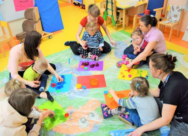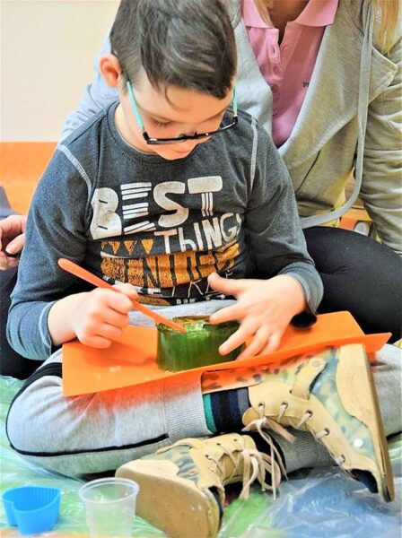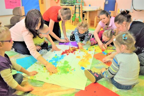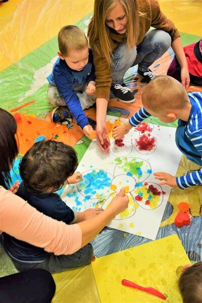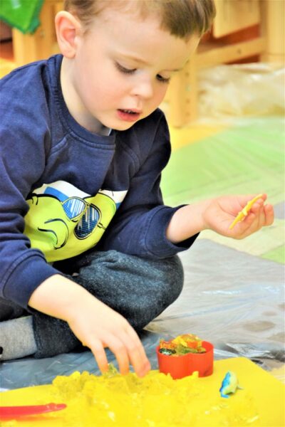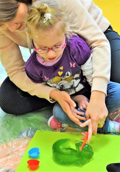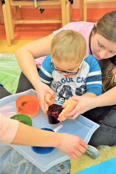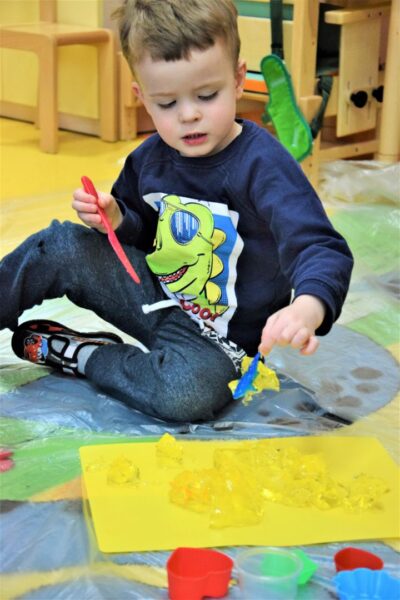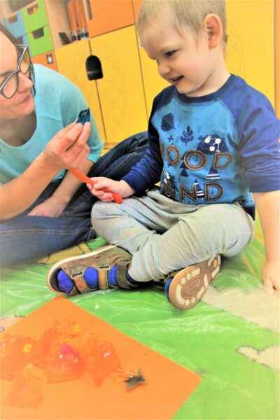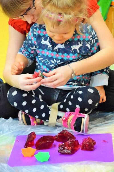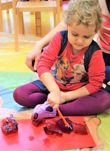 W przedszkolu AMIś chcemy rozwijać zmysły i kreatywność naszych dzieci stąd też jedną z form regularnego wsparcia grupowego są zajęcia SENSOPLASTYKI. Co się działo? W każdej grupie szukaliśmy różnych stworów ukrytych w galaretkach… nie było to takie łatwe, ale za to przyjemne. A potem galaretkowe obrazy. Dzieci dotykały galaretki wspólnie i opisywały co czują pod palcami, wąchały, próbowały, pokazywały jak się trzęsą, opowiadały o konsystencji, czy są śliskie, jak pachną itd. Dzieci podrzucały i zgniatały galaretkę. Pozwoliliśmy uruchomić wyobraźnię naszym dzieciom, już one najlepiej wiedziały co z galaretką zrobić.
