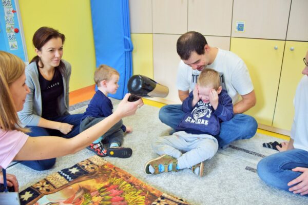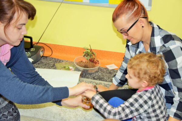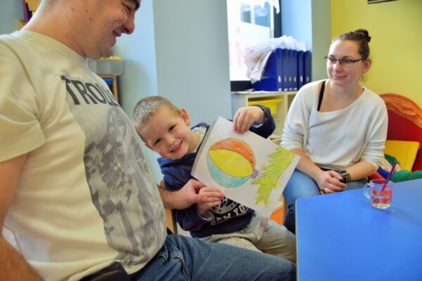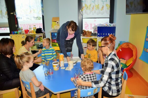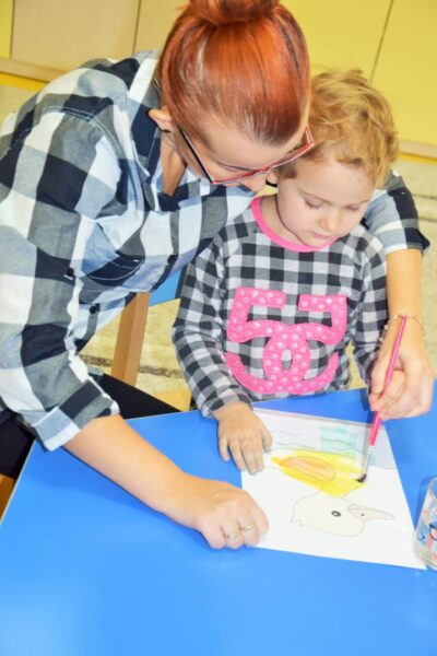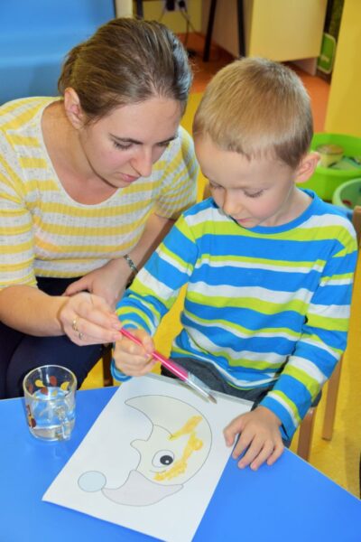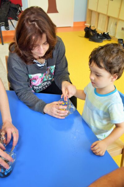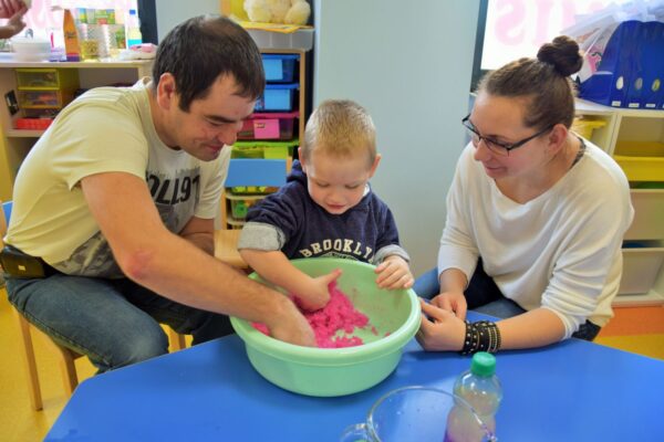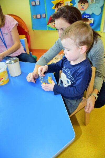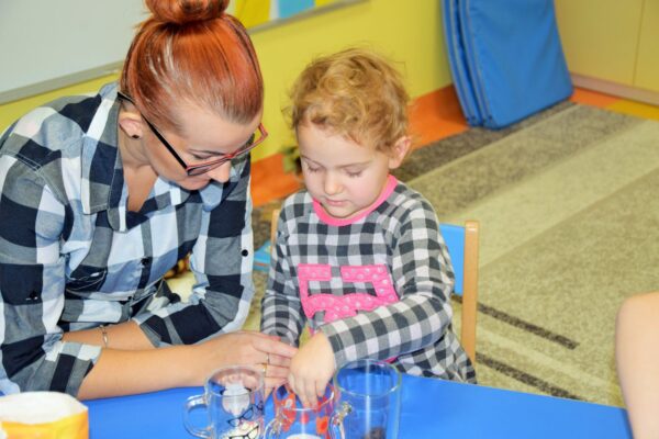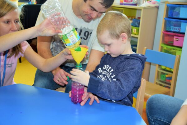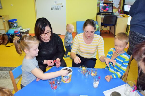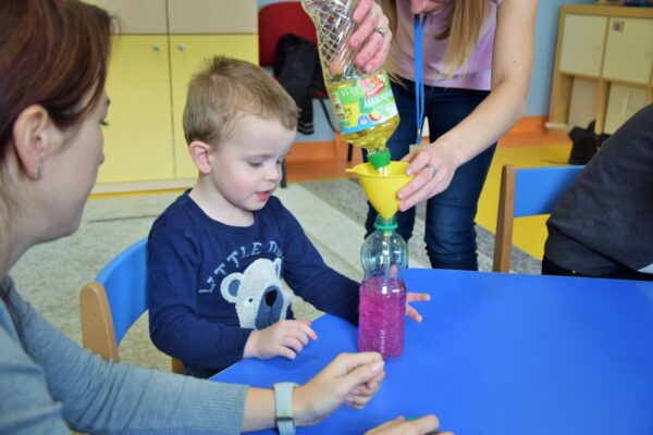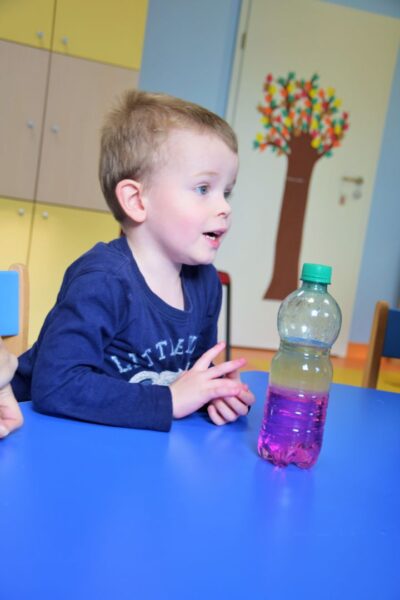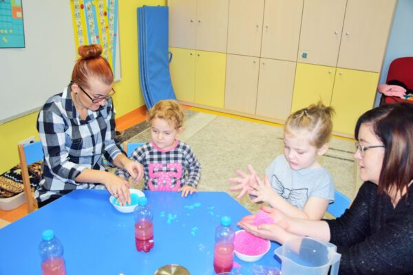 Miło jest nam gościć rodziców w naszym przedszkolu. Mogą w tedy zobaczyć jak wygląda nasz dzień pełen nauki i zabawy. Wspólnie z rodzicami odkrywaliśmy jakie właściwości ma woda. Wiemy jaki jest odgłos wody kapiącej, deszczu, szum morza. Robiliśmy wspólnie doświadczenia, które pokazały nam jakie produkty rozpuszczają się w wodzie, a jakie nie. Ciocie dały nam też miski z wodą i wsypały do nich magiczny proszek „Glibbi”, który musieliśmy wymieszać rączkami. Czy wiecie co się z tą wodą stało? Jeśli nie, wypróbujcie to w domu. Ciocie zafarbowały nam też wodę na kolor fioletowy i wlały ją do połowy plastikowej butelki, a do pozostałej części wlały olej. Jak myślicie czy olej zmieszał się z wodą? Na koniec malowaliśmy z rodzicami obrazki za pomocą pędzelka i wody. Efekty naszej wspólnej pracy zobaczycie na zdjęciach.