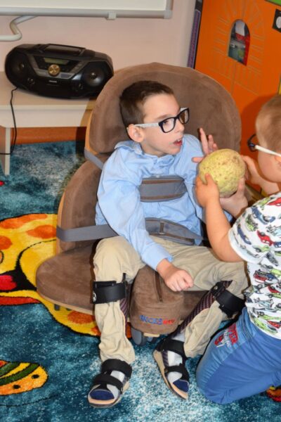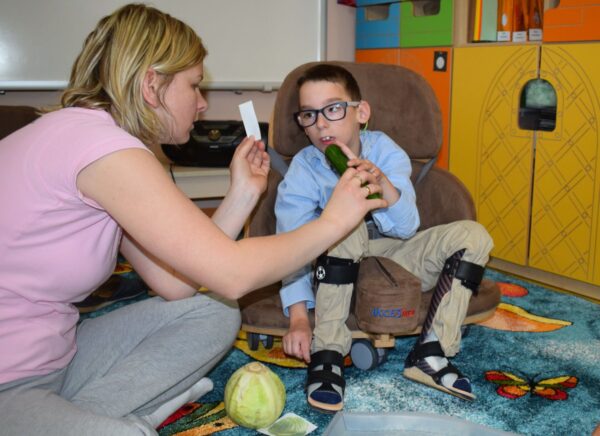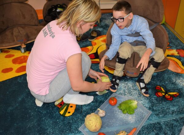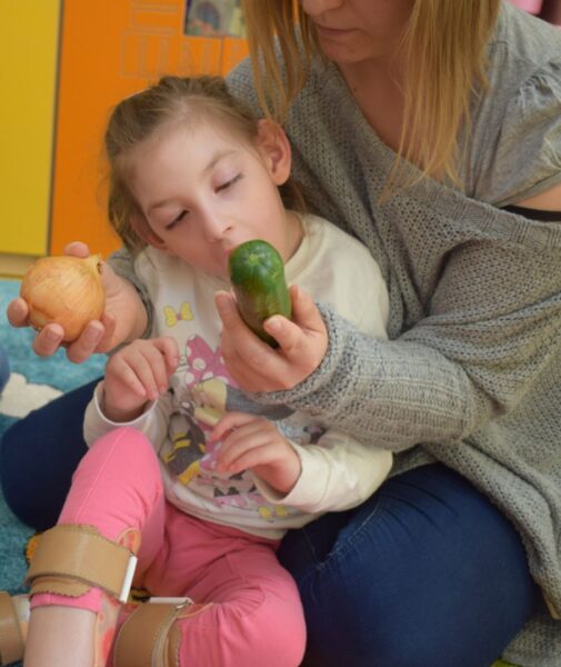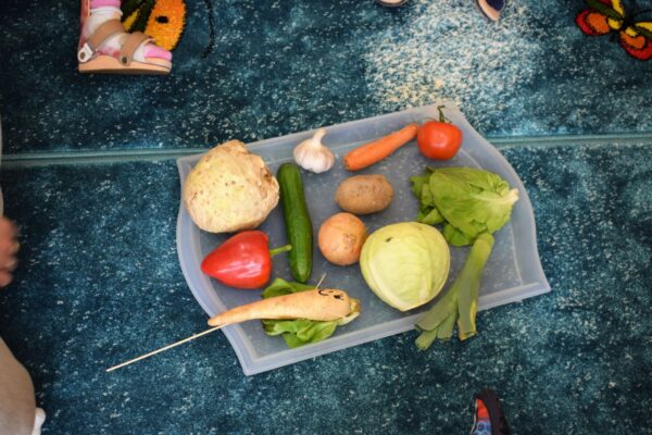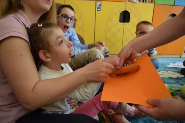 Do grupy VI na zajęcia przybyła Pani Witaminka – była to kukiełka zrobiona z warzyw. Na początku przywitała się z dziećmi przy piosence „Witaminki, witaminki”. W czasie piosenki dzieci wystukiwały rytm na instrumentach. Po niej ciocia opowiedziała wiersz „Witaminka”, którego z zaciekawieniem wysłuchały dzieci. Następnie dzieci oglądały i dotykały wszystkie warzywa jakie znalazły się na zajęciach. Przy tym dopasowywaliśmy kolor warzywa do odpowiedniego koloru kartki. Na zakończenie zajęć dzieci wykonały prace plastyczną, w której miały za zadanie wykleić plasteliną kontur otrzymanego warzywa. Już teraz dzieci wiedzą, że warzywa są ważne dla zdrowego odżywiania.