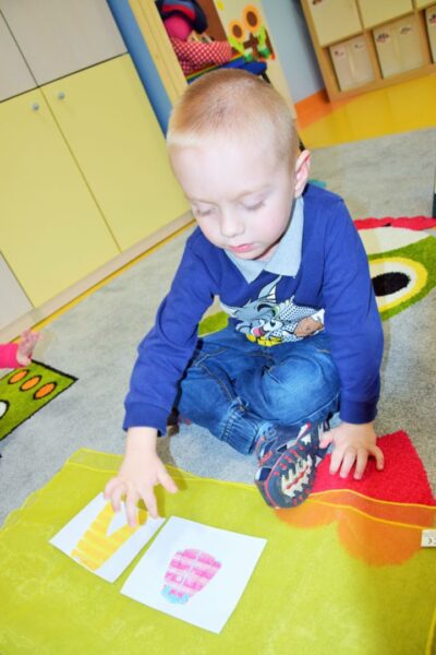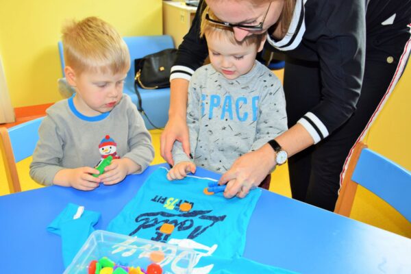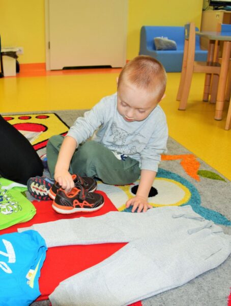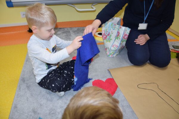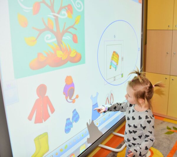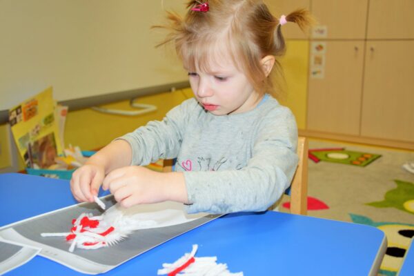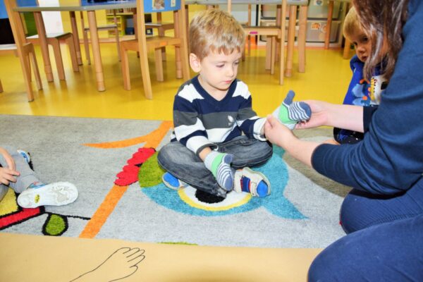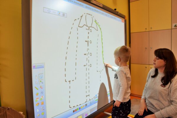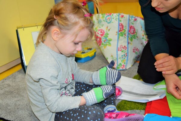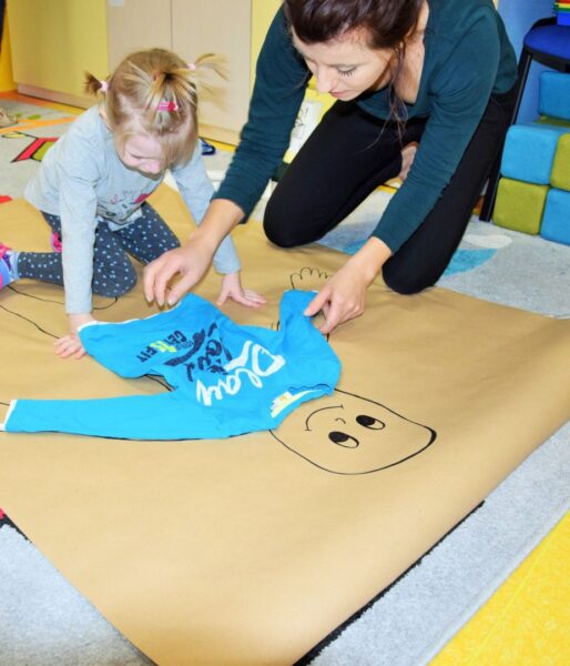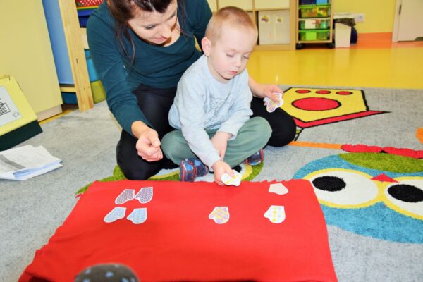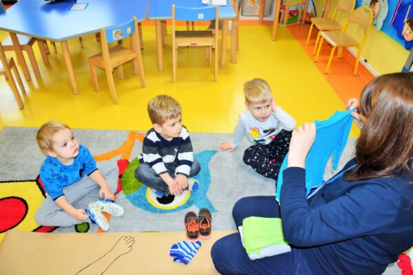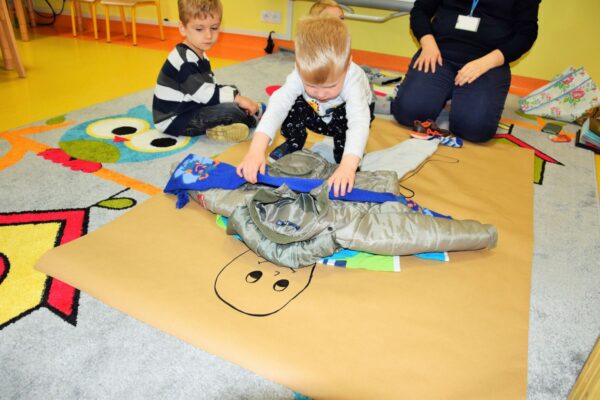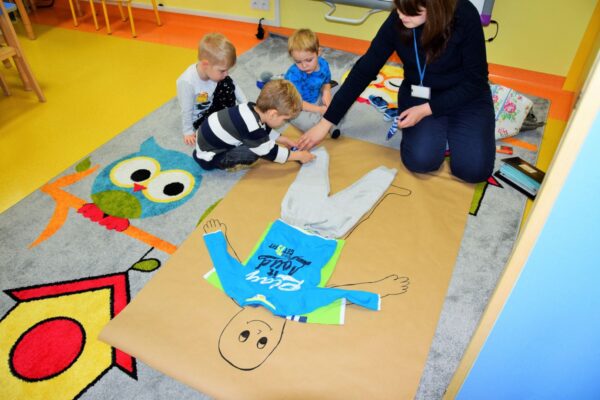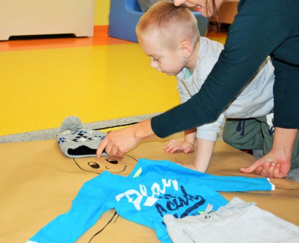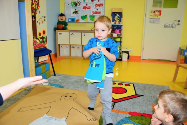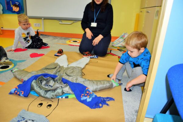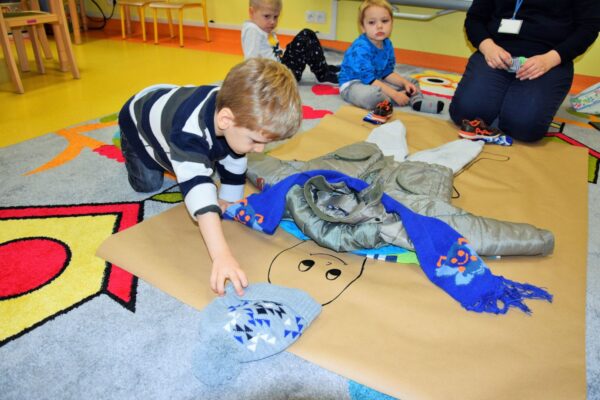W tym tygodniu w grupie Sówek dzieci uczyły się jak się ubrać w chłodne dni. Dzieci dowiedziały się co należy założyć na siebie jesienią i zimą oraz w jakiej kolejności. Samodzielnie próbowały zakładać kurtki, czapki, szaliki i rękawiczki podczas przygotowań do codziennych spacerów. Dzieci ubierały też na zajęciach postać chłopca w prawdziwe ubrania. Musiały dopasować ubranie do części ciała.