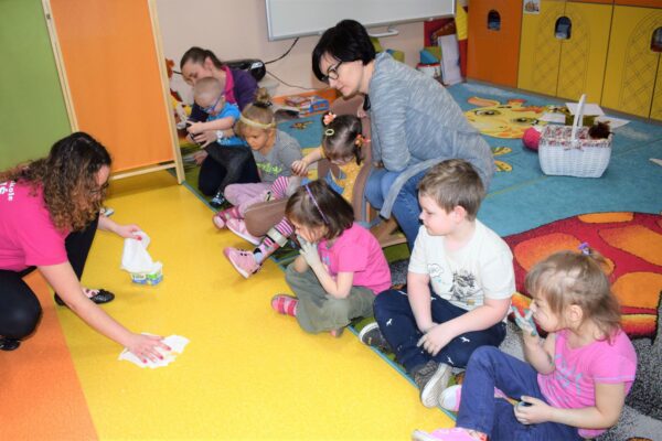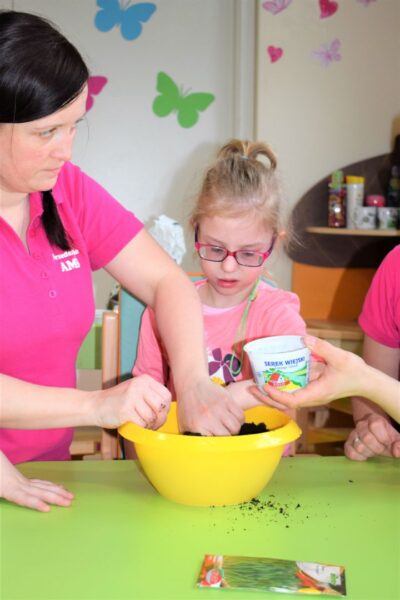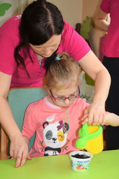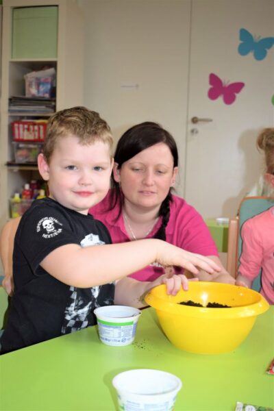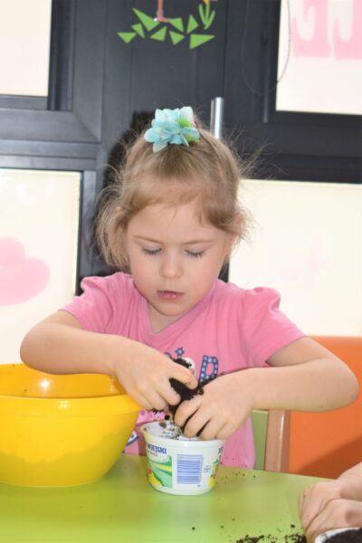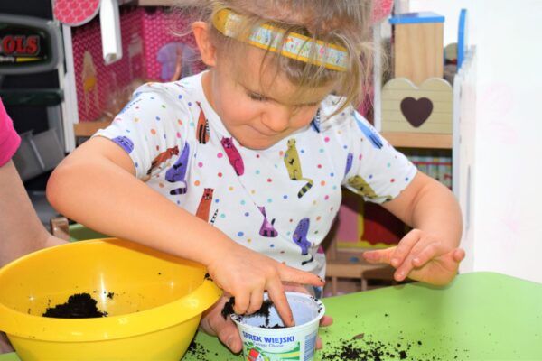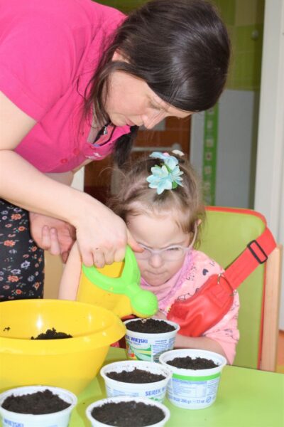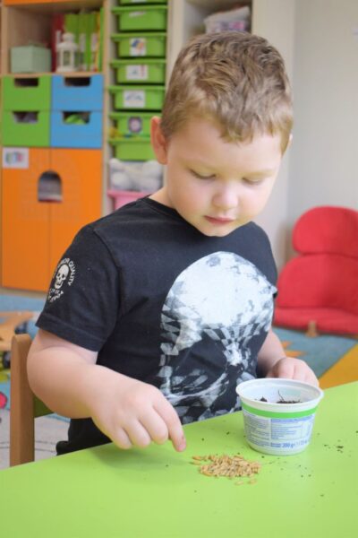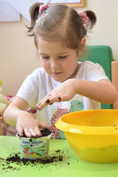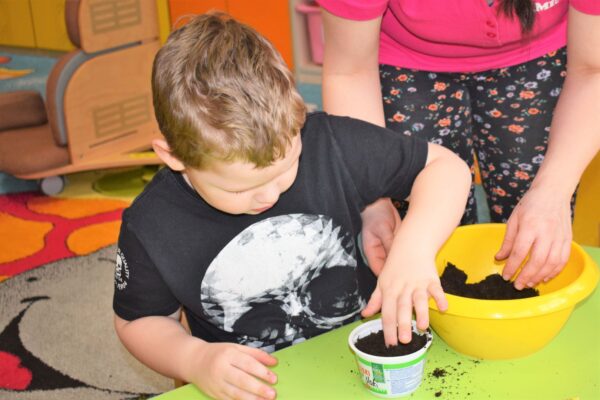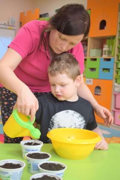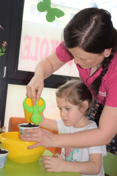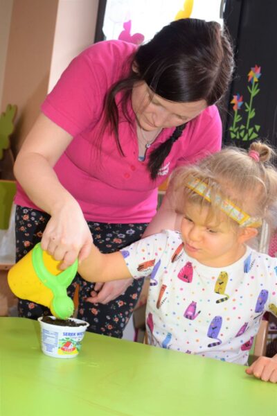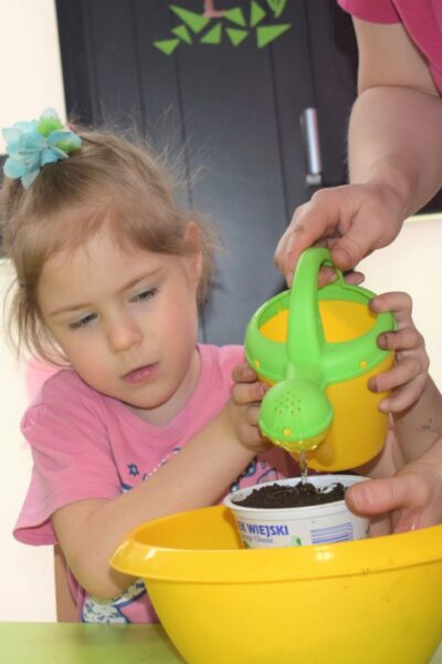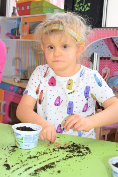 Przyszła wiosna, a więc nadszedł czas na pierwsze wysiewy. Nasze Jeżyki posiały owies oraz rzeżuchę. Dzieci były zachwycone tym, że od początku do końca mogą uczestniczyć w procesie wysiewu nasion. Każdy sam lub z niewielką pomocą cioci mógł wsypać ziemię do pojemniczków, zrobić dziurki, posiać nasionka, zasłonić je ziemią, a na koniec podlać. Codziennie dzieci będą dbały o roślinki – podlewając je. Każdego dnia dzieci będą też obserwowały poziom wzrostu roślin i przebieg stopnia ich rozwoju.
