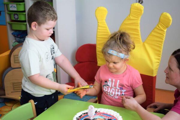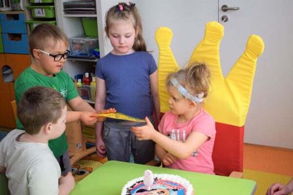 Dziś u Jeżyków świętowaliśmy urodziny Helenki. Z tej okazji koledzy i koleżanki z grupy wręczyli jej kartkę urodzinową. Na urodzinach gościły też dzieci z grupy biedronek, oni również wręczyli Heli przepiękną kartkę urodzinową. Było głośne sto lat i moc życzeń. Wszyscy razem skosztowali przepysznego tortu.