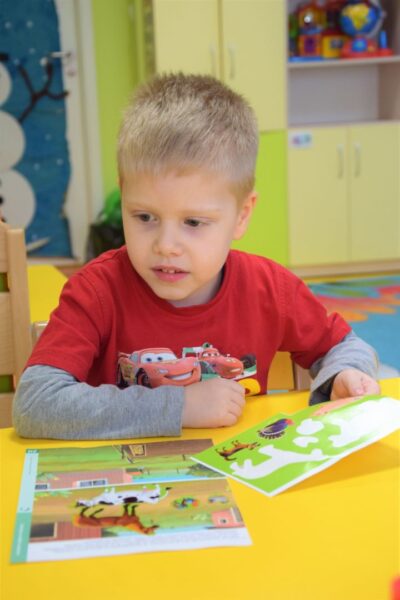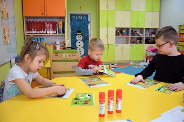 Małe Biedroneczki poznały zwierzęta mieszkające na wsi. Wśród nich znalazły się krowa, koń, świnka, kura i kaczka. Amisiaki na podstawie kolorowych planszy opowiadały, gdzie mieszka dane zwierzątko oraz jak wygląda wiejskie podwórko. Prócz tego każde dziecko mogło przyporządkować dane zwierzątko do swojego domu. Kiedy już poznaliśmy wieś i zwierzęta ją zamieszkałe przedszkolaki wykonały przestrzenną stajnie, w której zamieszkał koń. Cała zabawa polegała na tym, iż dzieci same mogły wyciąć, pokolorować i poskładać stajnie dla konia. Wszystkie przedszkolaki razem z ciocią dzieliły nazwy zwierząt na sylaby, oraz brały udział w zabawie ruchowej, w której pomocne okazały się szarfy. Z niecierpliwością czekamy na kolejne zajęcia związane ze zwierzętami mieszkającymi na wiejskim podwórku.