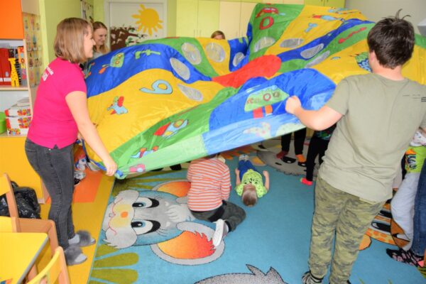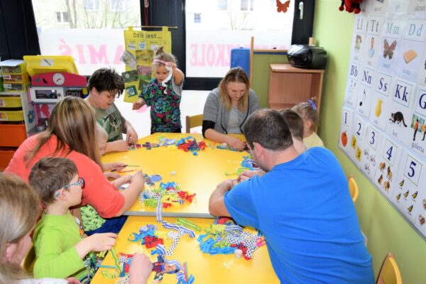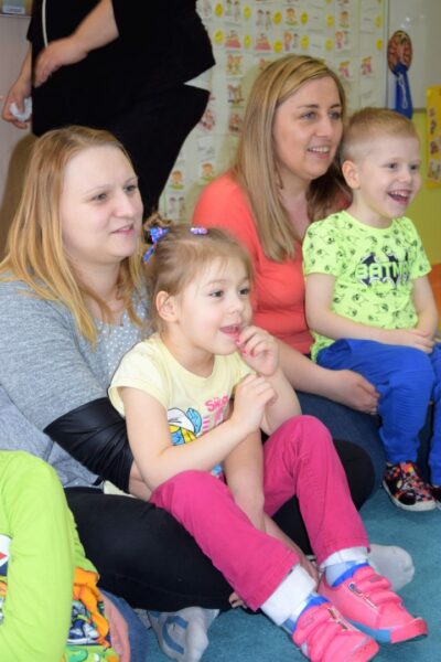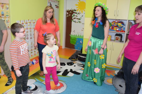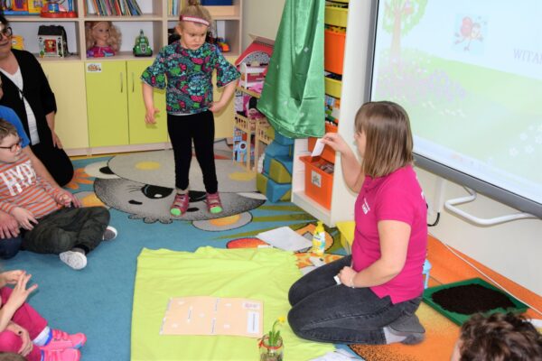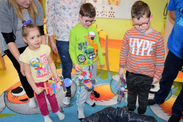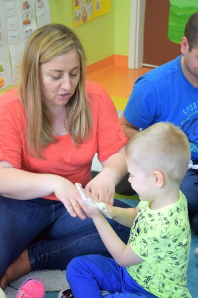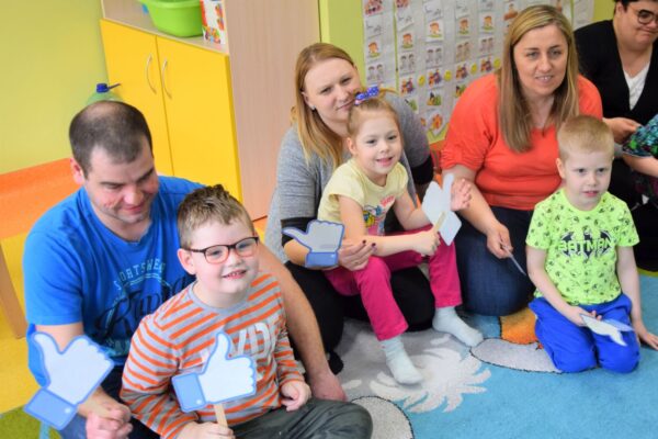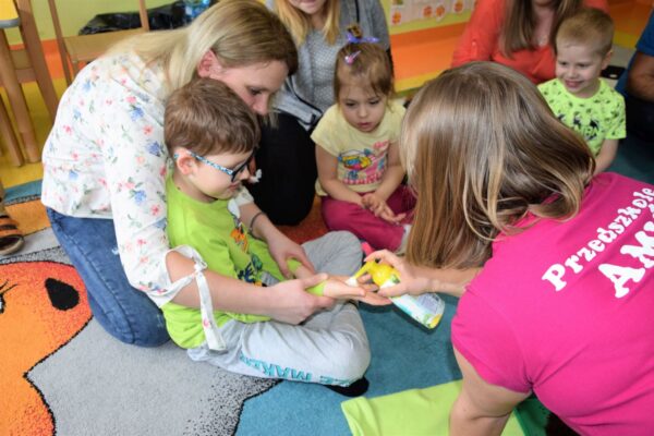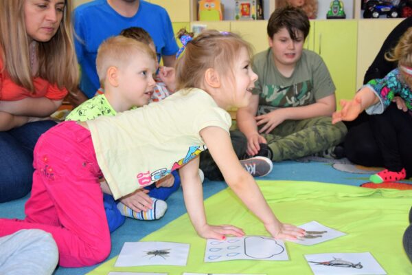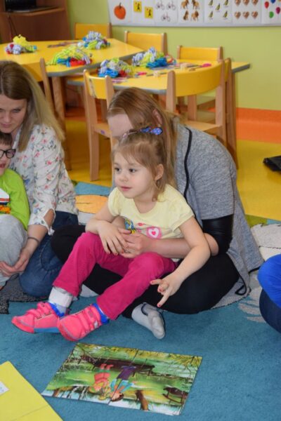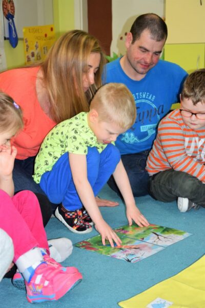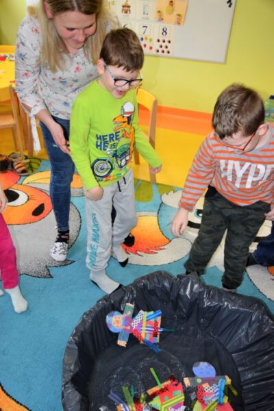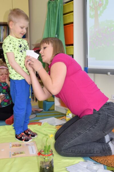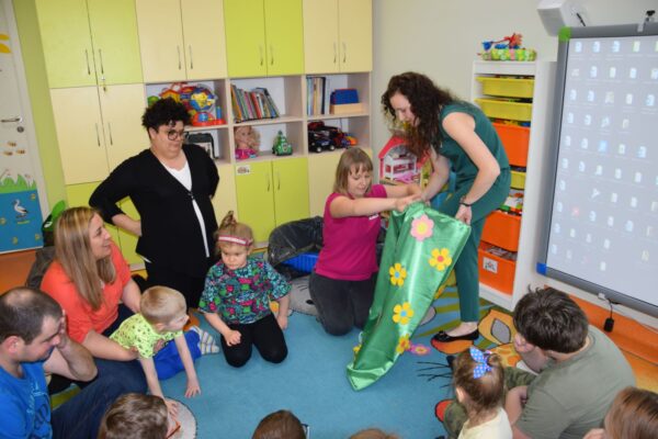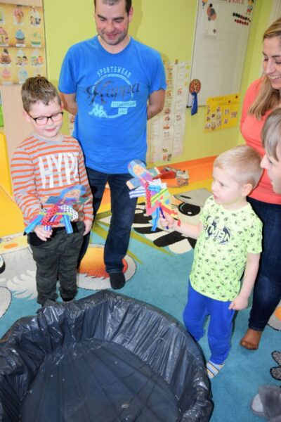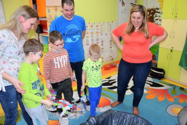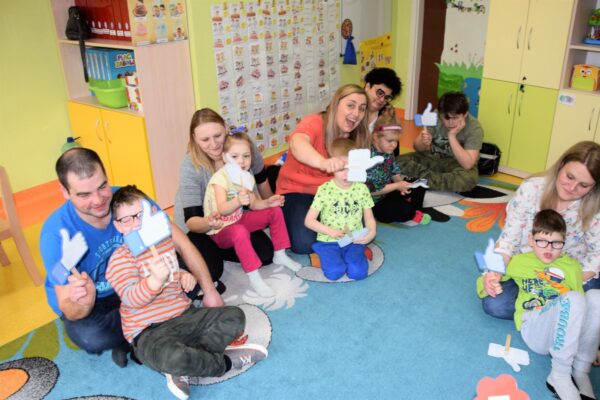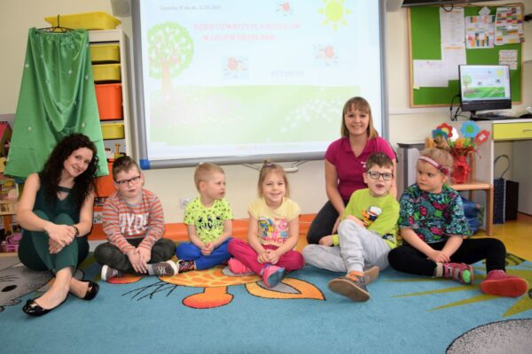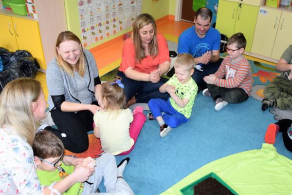 Dzień otwarty w grupie małych Biedronek przyniósł wiele ekscytacji i nowych doświadczeń. Sam początek zajęć zaczęliśmy od wierszyka i śpiewania piosenki powitalnej dla rodziców. Na Porannym kręgu dzieci polisensorycznie poznawały oznaki wiosny. Dotykały ziemi, wąchały kwiatka, cytrynę oraz słuchały wiosennych odgłosów. Do naszej planszy przyczepiliśmy zdjęcia z oznakami wiosny. Nie zabrakło zabawy z chustą animacyjną, która odgrywała rolę parasola. Rodzice trzymali chustę i chodzili z nią po okręgu, a dzieci były latającymi ptaszkami, które chowały się pod parasol kiedy muzyka ucichła. Po zabawie przyszedł czas na rozwiązanie krzyżówki, której rozwiązaniem było hasło MARZANNA. Po tej aktywności przyszedł czas na prace stolikowe przy, których dzieci z rodzicami ozdabiali sylwetę Marzanny. Przygotowane Marzanny wrzucaliśmy do basenu z wodą mówiąc przy tym wierszyk „Marzanno, Marzanno Ty Zimowa Panno, Ciebie pożegnamy, Wiosnę przywitamy”. Dzieci z niecierpliwością czekały na przyjdzie wiosny, zanim jednak to nastąpiło wspólnie z rodzicami przystroili spódnicę, którą Pani Wiosna włożyła. Wszyscy razem odśpiewaliśmy piosenkę „Maszeruje Wiosna”. Po tym przywitaniu Pani Wiosna przeczytała zaproszonym gościom zagadki, na które wszyscy odpowiadali podnosząc kciuk w górę lub w dół. Później przyszedł czas na czytanie wierszyka i obrazowanie jego słów na tablicy multimedialnej. Po tych zajęciach dzieci wraz z rodzicami mogły się zrelaksować przy muzyce „odgłosy łąki”. Wszystkim bardzo dziękujemy za przybycie oraz branie czynnego udziału w zajęciach.