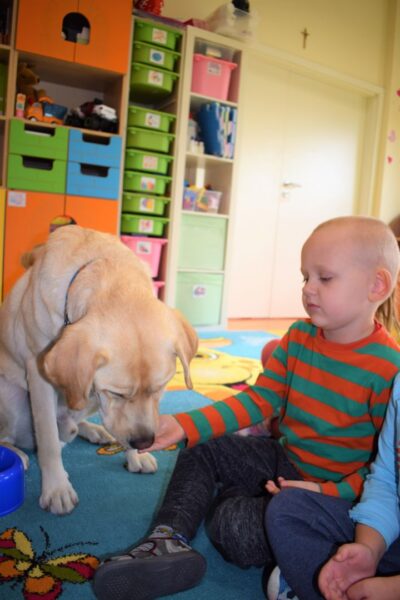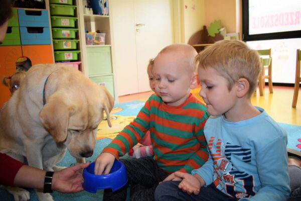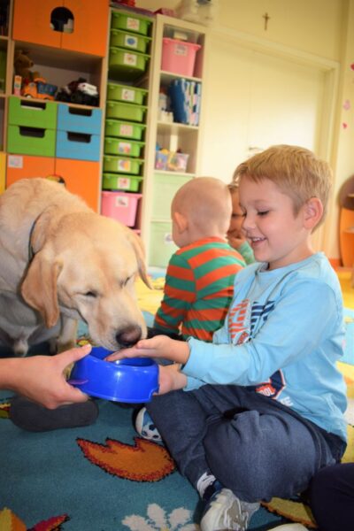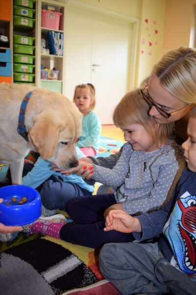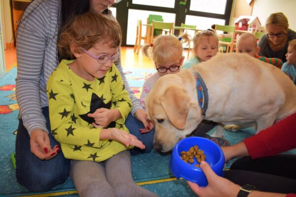 Nasze Amisiaki bardzo lubią dzień, w którym odwiedza je czworonożny przyjaciel Lambo. Mogą się z nim bez obaw pobawić. Dzieci podczas zajęć uczą się jak dbać o psy, żeby nie zrobić im krzywdy. Najbardziej oczekiwanym momentem jest czas karmienia! Najodważniejszym dzieciom piesek zjada chrupki z ręki.