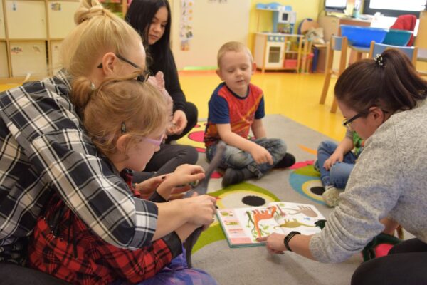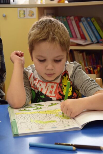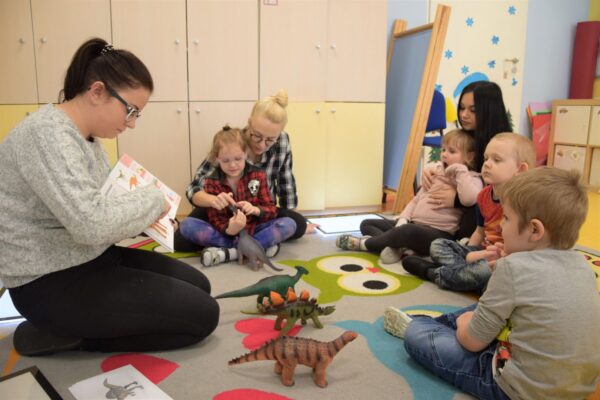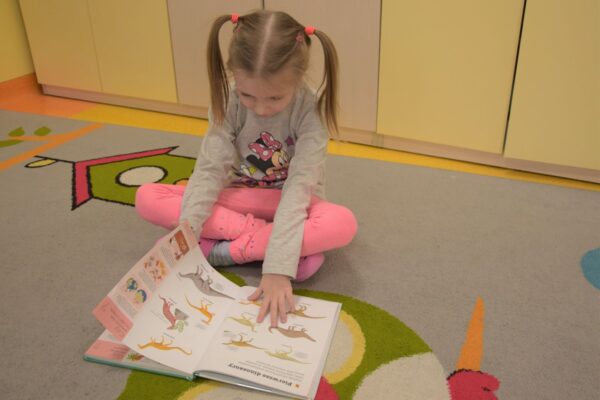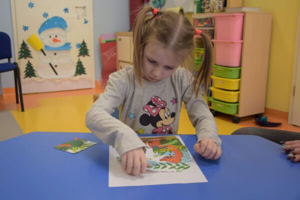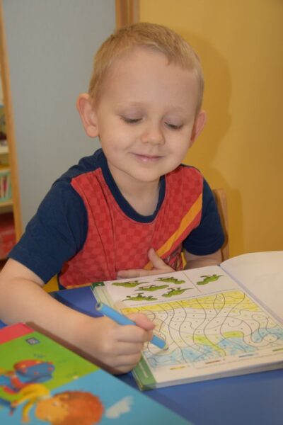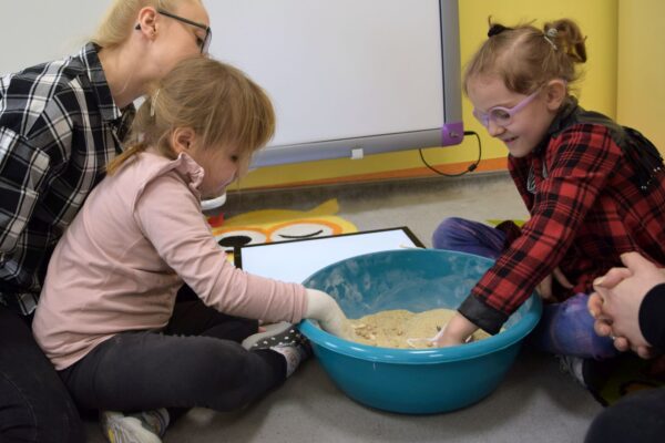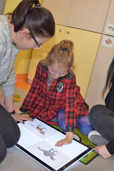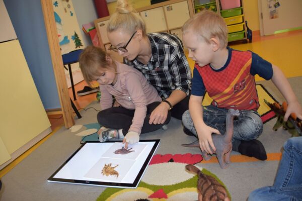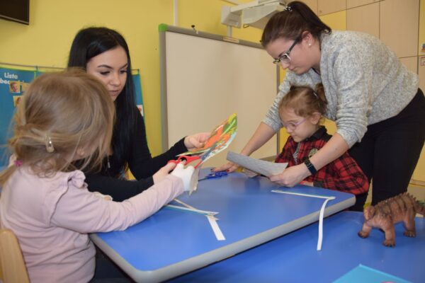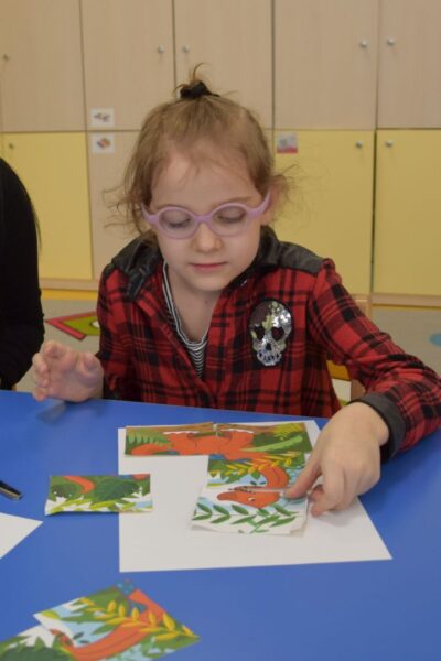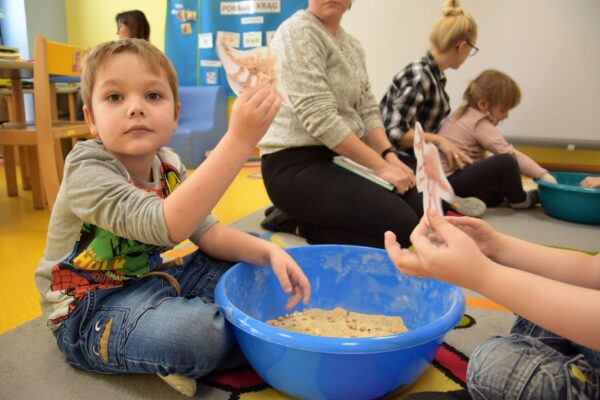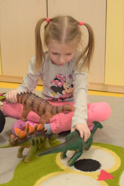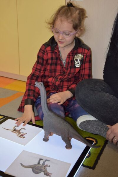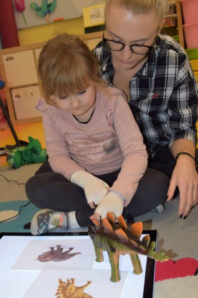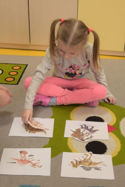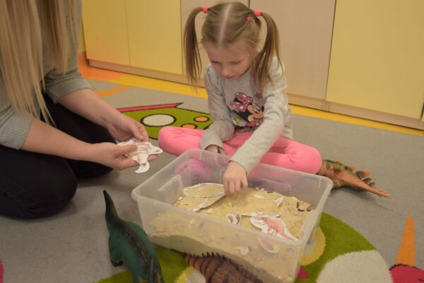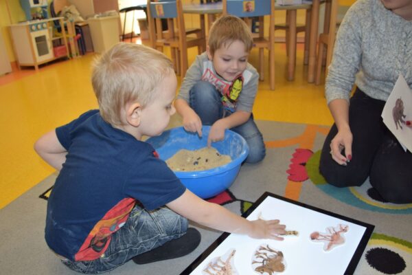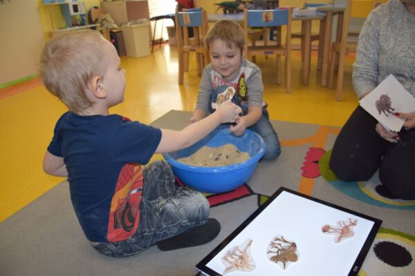 Dzisiaj dzieci z sali Sówek przeniosły się w czasy prehistoryczne. Rozmawialiśmy na temat dinozaurów, ćwiczyliśmy percepcje wzrokową rozpoznając różne gatunki tych prehistorycznych stworzeń. Poznaliśmy nowy zawód, już wiemy czym zajmuje się Archeolog. Mogliśmy wcielić się w jego role i odkopać z piachu szczątki dinozaurów. Na koniec wykonaliśmy karty pracy związane z naszym tematem.
