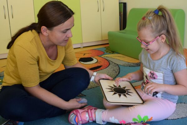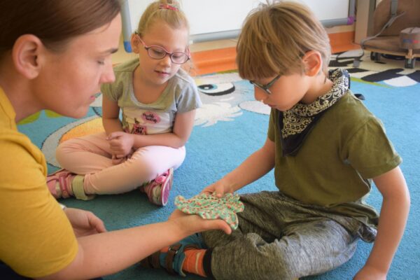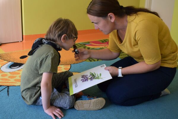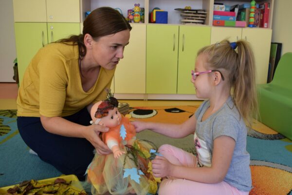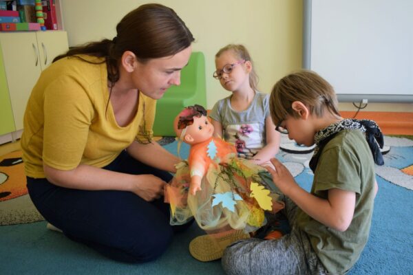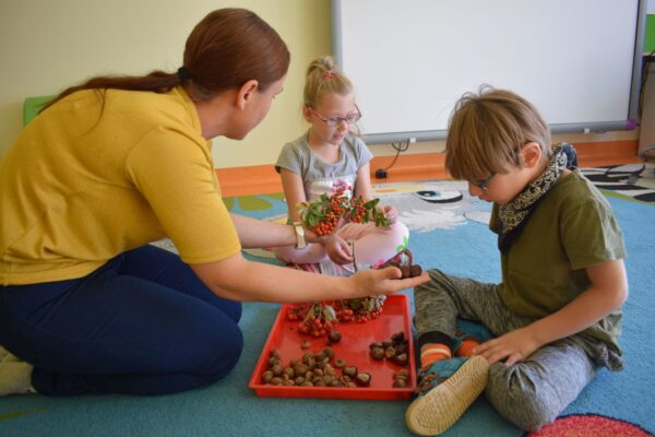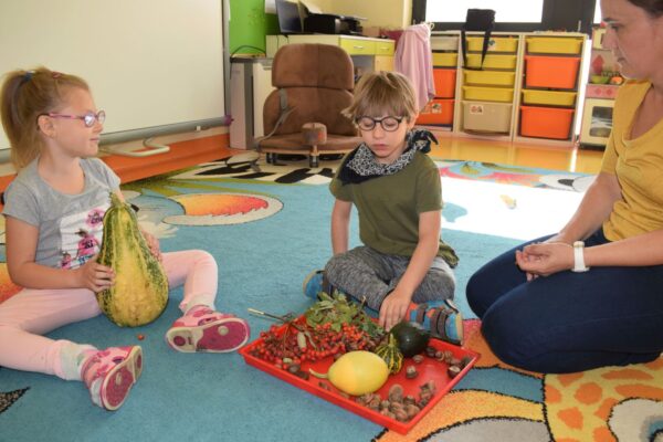 W kalendarzu mamy już jesień. Przekonały się o tym dzieci w trakcie porannego kręgu, podczas którego Zuzia i Julek radośnie przywitali się z panią Jesienią. Postać ta zawierała charakterystyczne dla siebie kolorowe liście, które razem z ciocia oglądaliśmy. Następnie sprawdziliśmy pogodę oraz dowiedzieliśmy się jaki jest charakterystyczny zapach tej pory roku – lawenda. Jesień przyniosła ze sobą swoje dary w postaci ozdobnych dyń o różnych rozmiarach które dotykaliśmy oraz próbowaliśmy podnieść, znalazły się u nas także jarzębina, żołędzie i kasztany. Jesteśmy ciekawi jakie jeszcze dary i niespodzianki niesie za sobą nasza kolorowa jesień. O tym pewnie dowiemy się już niedługo.