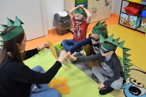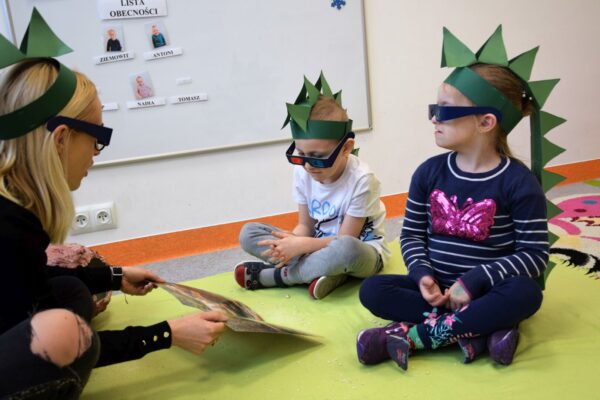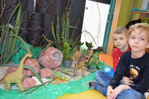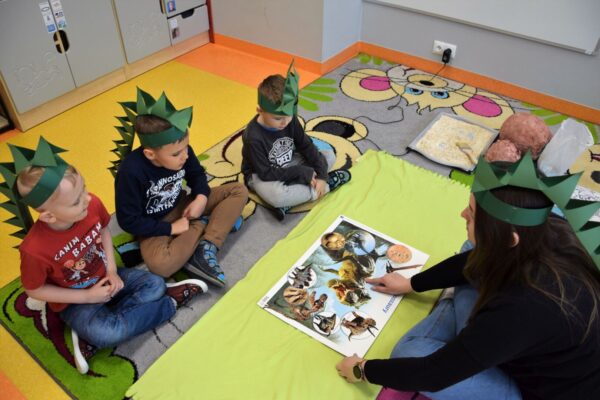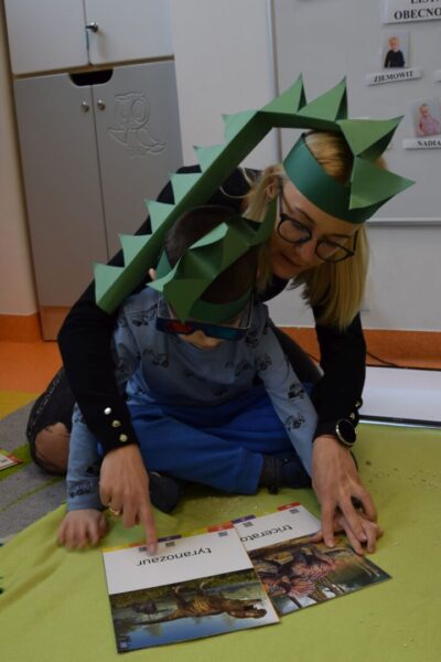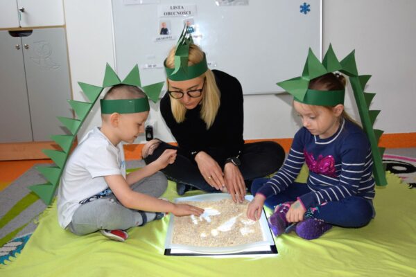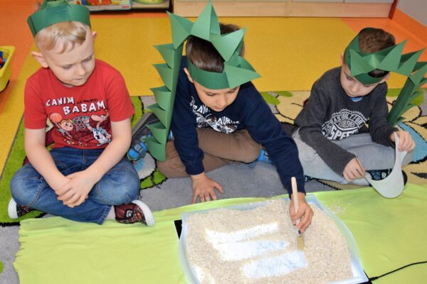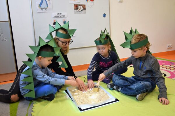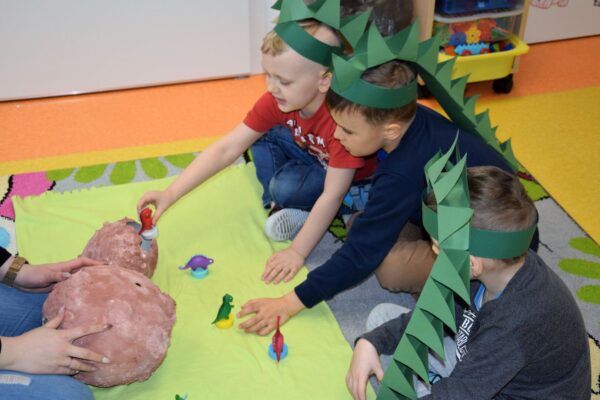 Dzieci z grupy Kotów i Sówek obchodziły Dzień Dinozaura. Amisiaki zmieniły się w małe dinozaury i przeniosły do prehistorycznych czasów, gdzie za pomocą okularów 3D mogły podziwiać różnorodne okazy dinozaurów. Dzieci poznały ich historię , jak wyglądały i czym się żywiły. Amisiaki dowiedziały się także, czym zajmuje się archeolog i przeprowadziły małe wykopaliska, odszukując szczątek dinozaurów w piasku za pomocą pędzelków. Był to czas pełen ciekawych wrażeń i doświadczeń.