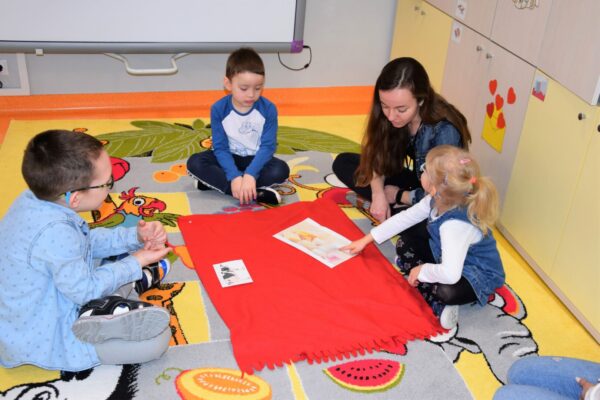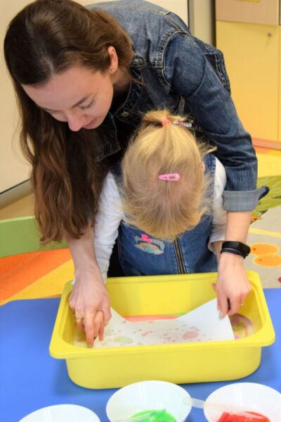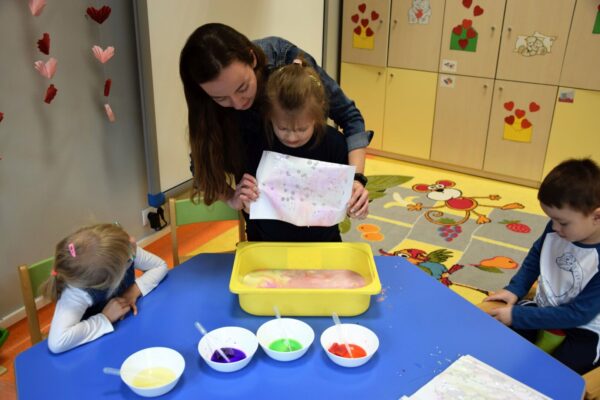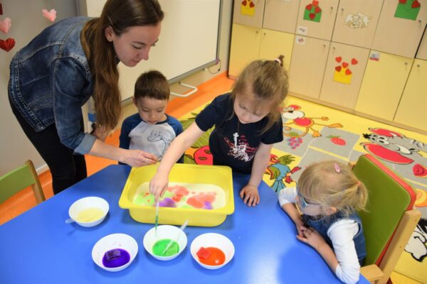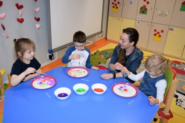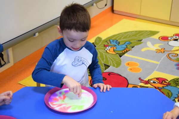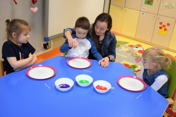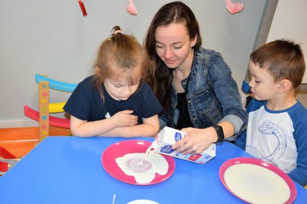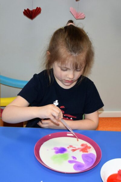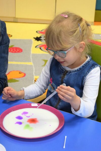 Mleko – takim tematem nasze Amisiaki zajmowały się w ostatnim czasie. Rozmawialiśmy o tym, jakie zwierzę daje nam mleko i jak to się dzieje, że trafia na nasze stoły. Dla utrwalenia dzieci z grupy Biedronek ułożyły historyjkę obrazkową, która przedstawiała różne etapy produkcji mleka. Wiemy również co produkuje się z tego białego płynu, że są to m. in.: sery i jogurty, które tak często z chęcią zajadamy. Bardzo chcieliśmy, aby nasze mleko stało się kolorowe i pomalowaliśmy je wodą, która była zabarwiona bibułą. Wyszła nam wspaniała tęcza na talerzu! Na koniec z pomocą cioć powstało kosmiczne malowanie w którym oczywiście używaliśmy mleka. Każdy obrazek wyszedł inny, niepowtarzalny, jak każdy z nas.
