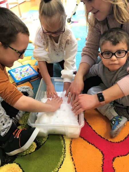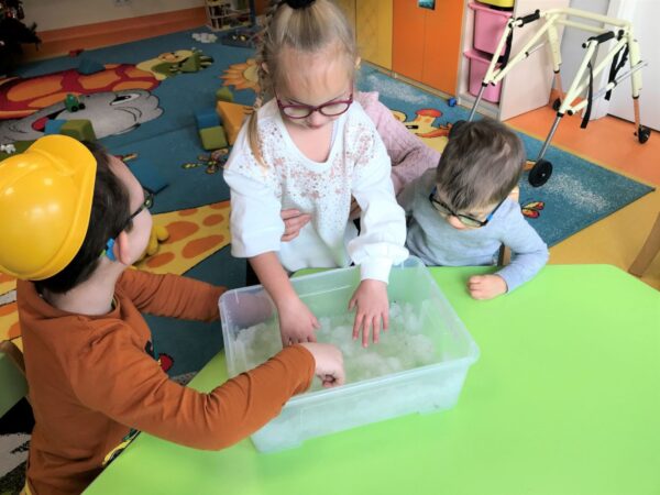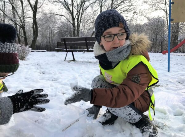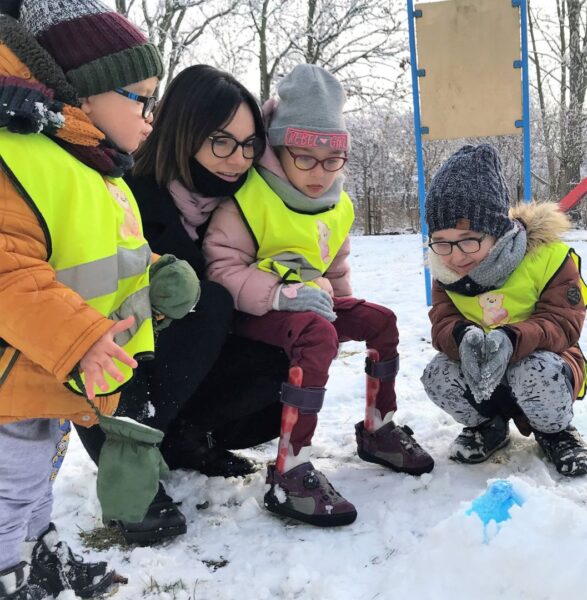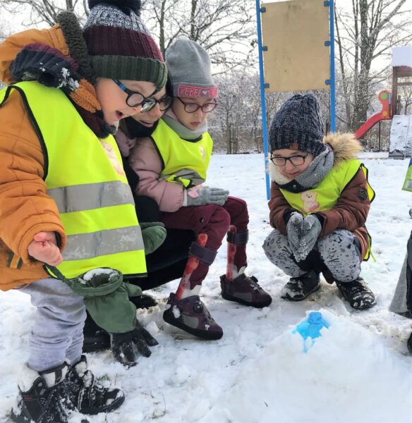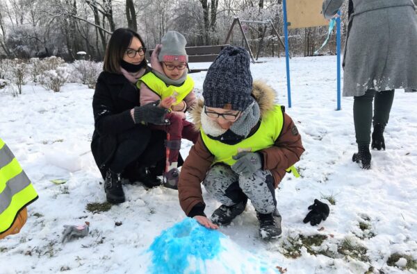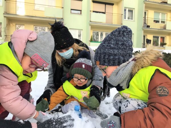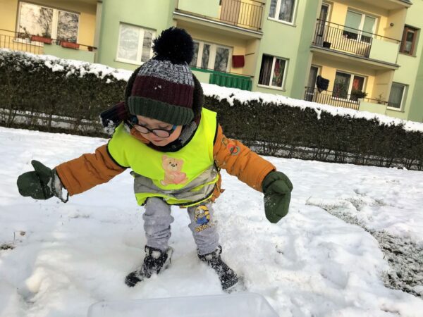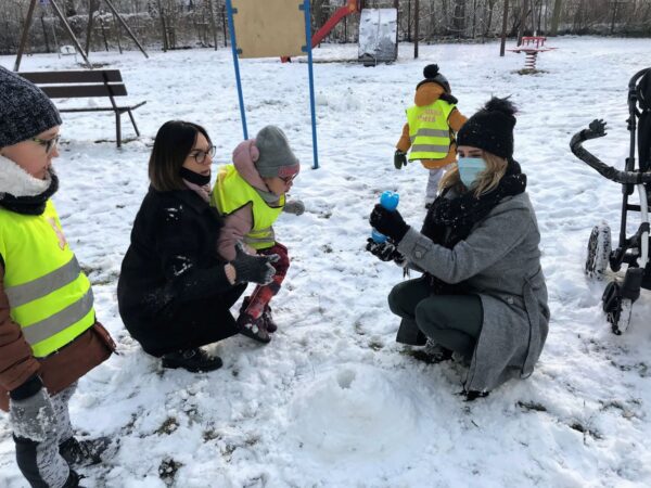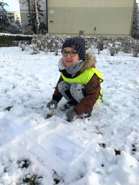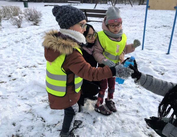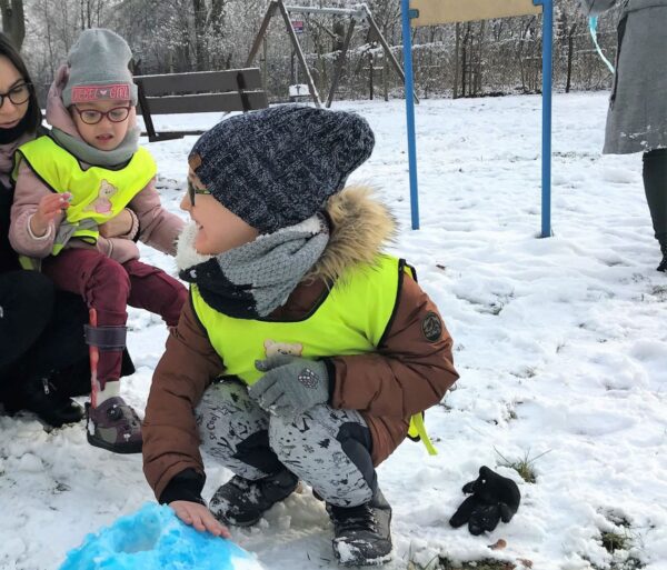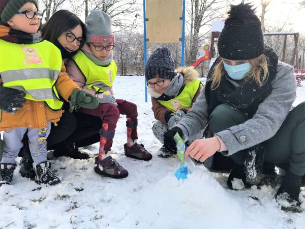W końcu można poszaleć i porzucać się śnieżkami. Nie obyło się też bez konkursu rzucania śnieżkami w dal. Ale tym razem Amisiowa grupa Jeżyków postanowiła zrobić coś jeszcze. Pomyśleliśmy, aby trochę poeksperymentować i postanowiliśmy sprawdzić jak mógłby wyglądać śnieżny wulkan. Dzieci zbudowały go z pomocą cioć a potem po dodaniu sekretnych składników wulkan eksplodował. Może nie wyglądał jak prawdziwa Etna, ale dzieciom się podobało. 🙂 Na koniec zabraliśmy ze sobą trochę śniegu do przedszkola, aby sprawdzić czy śnieg, który jest bały, jest czysty. Dzieci pozwoliły, aby się rozpuścił i z zaciekawieniem sprawdzały czy woda jest czysta czy brudna.