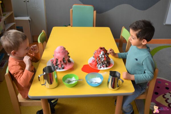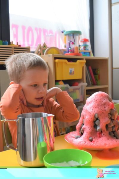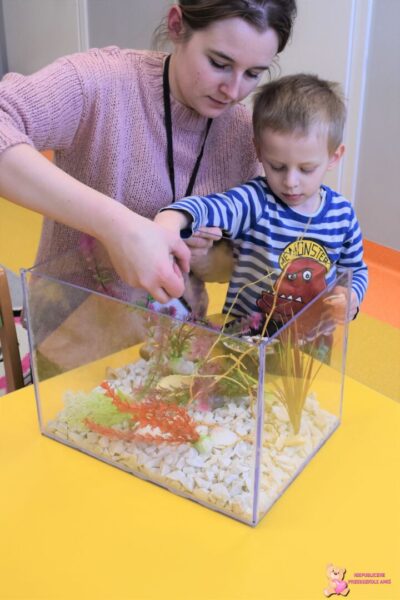 z nimi ”popływaliśmy”. Pracowaliśmy dzielnie tworząc „akwarium”, w którym zamieszkały rybki. W kartach pracy umieszczaliśmy nalepki ze zwierzętami w odpowiednich rzędach. Na koniec wykonaliśmy eksperyment „Wulkan’” z wyciekającą lawą. Bawiliśmy się również w zabawę „Woda i ziemia – co gdzie pasuje?” sprawiło to nam wiele radości.