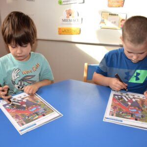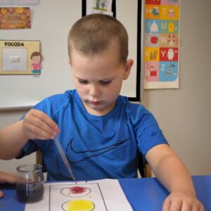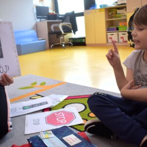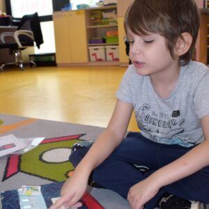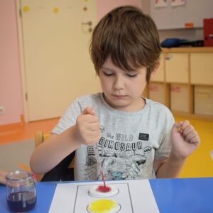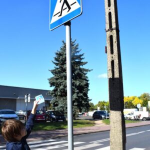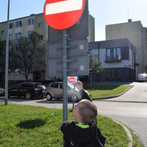 Grupa zajączków w tym tygodniu rozszerzała swoją wiedzę na temat bezpieczeństwa na drodze. Przedszkolaki przypomniały sobie sposoby bezpiecznego przechodzenia przez jezdnię oraz podawały nazwy podstawowych znaków drogowych. W celu utrwalenia wiedzy wybraliśmy się na spacer, aby odnaleźć znaki przedstawione na obrazkach wokół naszego przedszkola. Chłopcy z grupy zajączków wykonali prace plastyczną, gdzie za pomocą barwników i pipetek przypomniali sobie kolejność kolorów znajdujących się na sygnalizatorze świetlnym oraz wypełniali karty pracy wyszukując na ilustracji wskazane elementy, łączyli przedmioty z ich cieniami oraz uzupełniali brakujące elementy rytmu.