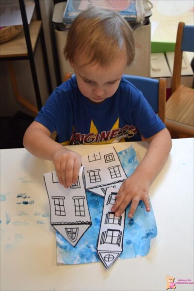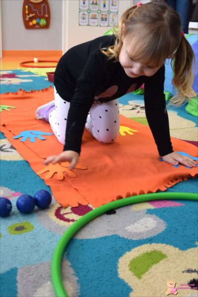 zakładając narty na swoje nogi. Ćwicząc motorykę dużą pokonywaliśmy tor przeszkód, a ćwicząc motorykę małą wykonaliśmy medale