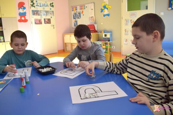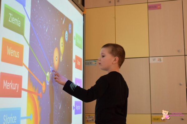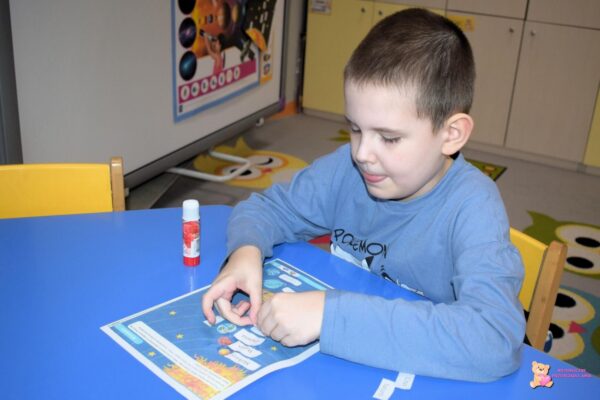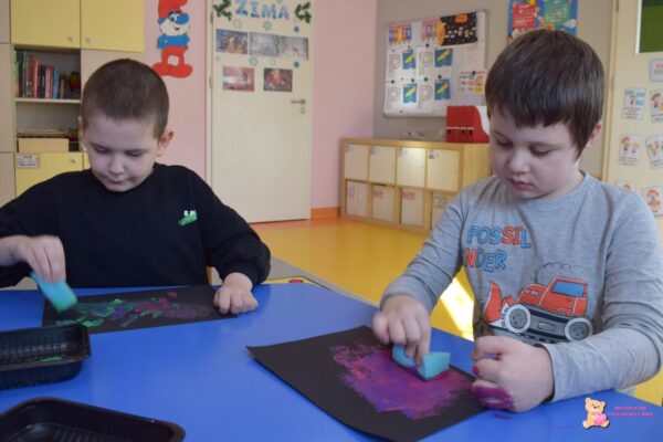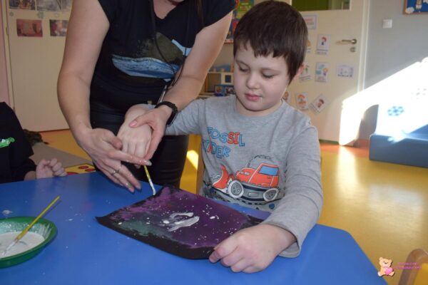 W tym tygodniu chłopcy z grupy „Zajączków” mieli okazję zgłębić tajemnice kosmosu i układu słonecznego🌎. Poznali nazwy planet 🪐oraz ich rozmieszczenie, a także dowiedzieli się, jak wygląda nasza galaktyka. W ramach twórczej zabawy dzieci stworzyły własne galaktyki💫, wykorzystując gąbki i różnorodne farby. W trakcie zajęć utrwaliły także literę „P” poprzez wyklejanie jej kawałkami folii aluminiowej, a następnie ćwiczyły jej pisanie po śladzie✏️. Całość utrwalono na tablicy multimedialnej, gdzie dzieci aktywnie uczestniczyły w zabawach edukacyjnych.🙂
