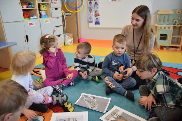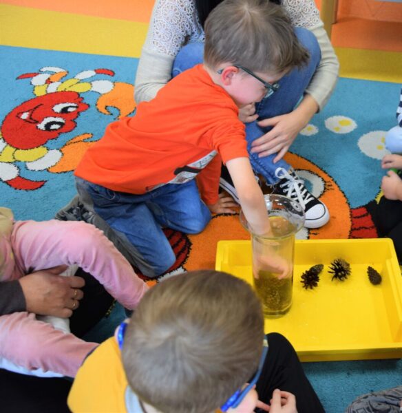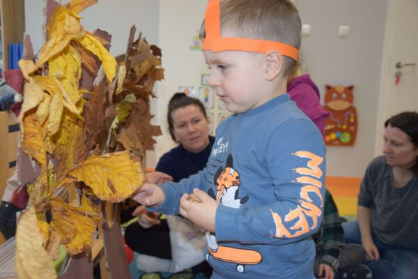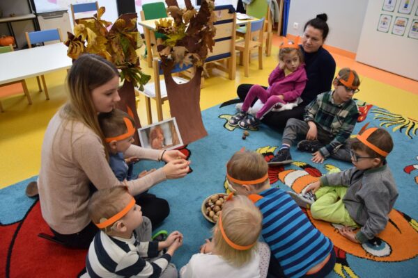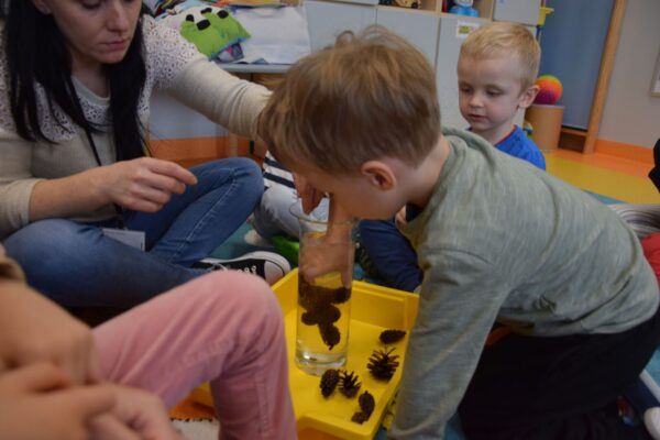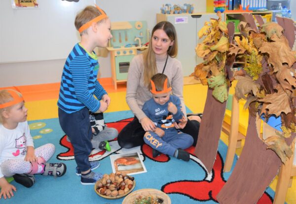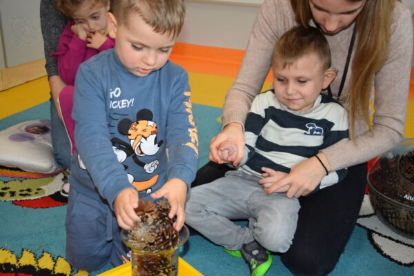 Pozostając w temacie jesiennych darów, grupa Gwiazdeczek tym razem zamieniła się w sprytne wiewióreczki. Przenieśliśmy się do lasu i zbieraliśmy to, co wiewiórki lubią najbardziej – kasztany, żołędzie i orzechy a potem zanosiliśmy je do dziupli. Ćwiczyliśmy zwinność, spostrzegawczość i koordynacje wzrokowo – ruchową. Poznaliśmy też innych mieszkańców lasu, a na koniec zrobiliśmy eksperyment z szyszkami. Sprawdzaliśmy co się z nimi dzieje kiedy są mokre, a co kiedy się wysuszą. Dzieci wrzuciły je do wody i obserwowały każdego dnia jakie zachodzą zmiany.