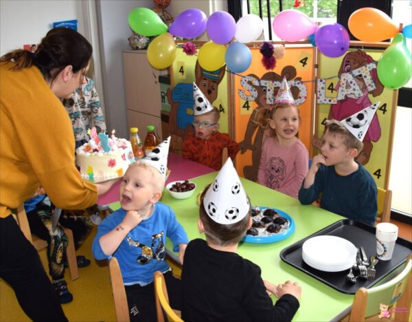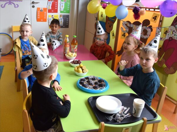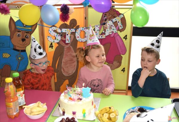 Dzieci zaśpiewały radosne „Sto lat!” oraz podarowały koleżance kartkę urodzinową. Następnie zasiadły do słodkiego poczęstunku przygotowanego przez mamę Mai.
