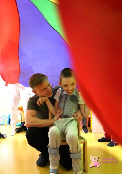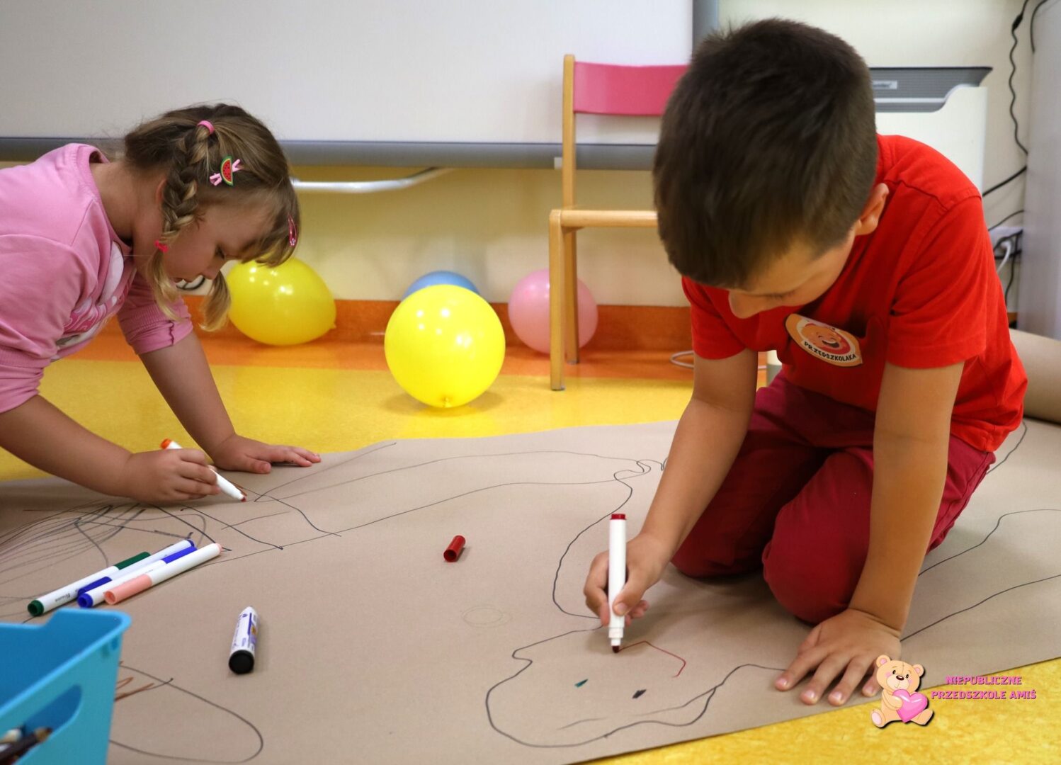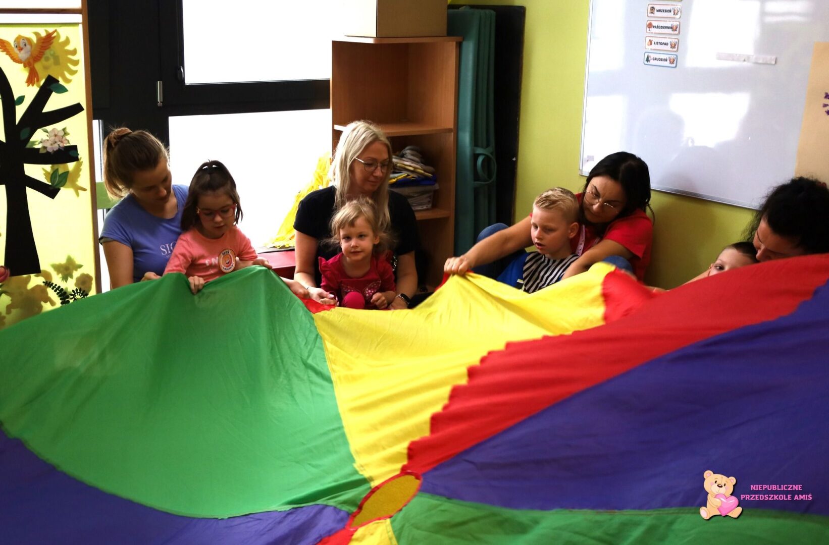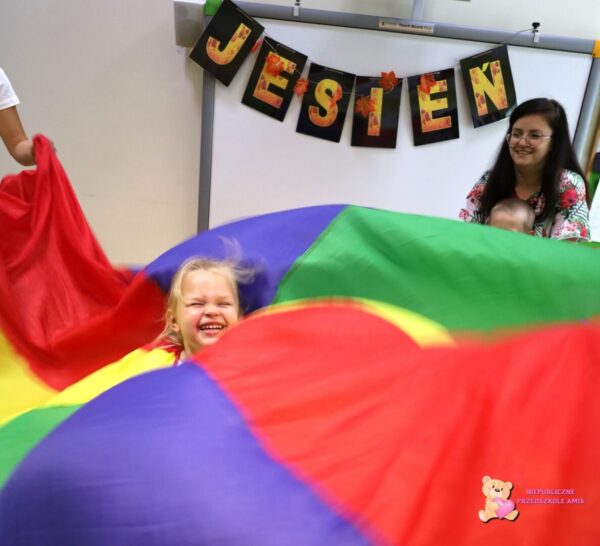 , a potem rozpoczęła się zabawa z chustą animacyjną. Amisiaki z entuzjazmem wzięły udział w zabawie we „Fryzjera” – wspólnie myliśmy włosy, suszyliśmy je i czesaliśmy… śmiechu było przy tym mnóstwo. Dzięki temu, że nasze dzieci ubrane były w swój ulubiony kolor, zamieniły się w cukierki… malinowe, truskawkowe, pistacjowe, czekoladowe lub kokosowe. Zawijaliśmy nasze „Amisiowe cukierki” w kolorowe papierki stworzone z chusty. Do „Jesiennej piosenki” dzieci zaśpiewały wykonując odpowiednie ruchy i grając na grzechotkach. Kolejną aktywnością było odrysowywanie sylwetek dzieci na papierze i ozdabianie ich kredkami, farbami i mazakami, co również sprawiło przedszkolakom dużo radości. Na koniec dzieci dostały zakładki do książek i słodkości. Był też czas na wspólne zdjęcia. Dzień Przedszkolaka w Przedszkolu Amiś był pełen radości, śmiechu i niezapomnianych chwil.![]()