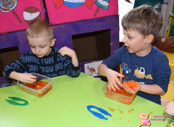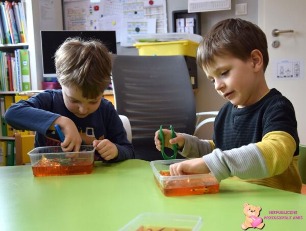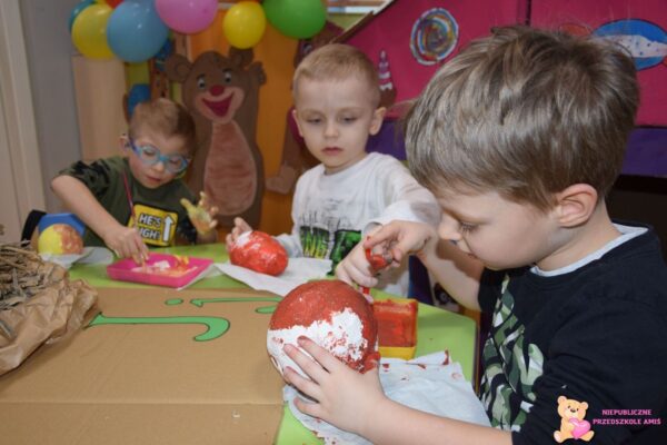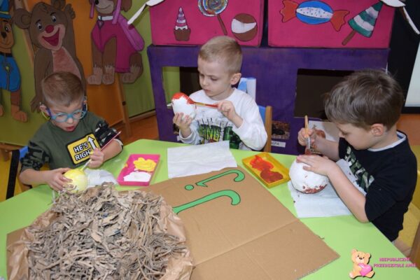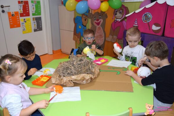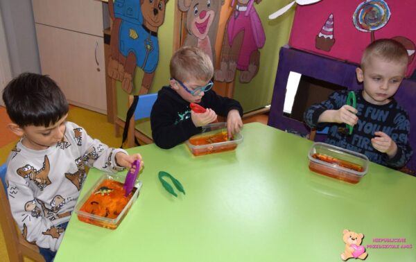 W bieżącym tygodniu grupa Jeżyków poznała świat dinozaurów. Dzieci wspólnie zbudowały gniazdo dinozaura oraz wypełniły je własnoręcznie malowanymi jajami. Przy okazji poznały literki 'J’ i 'j’. Rozmawialiśmy także o pracy archeologa i dzieci miały okazję wcielić się w jego rolę- przeprowadziły wykopaliska z wykorzystaniem piasku kinetycznego. Oglądaliśmy i omawialiśmy także pamiątki z dzieciństwa i ważnych dla siebie wydarzeń. Podczas zabawy sensorycznej z wykorzystaniem galaretki dzieci odwrażliwiały dłonie oraz ćwiczyły chwyt pęsetowy.