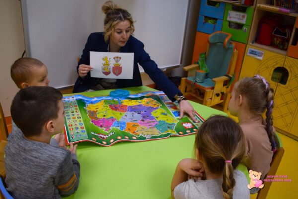 Rozmawialiśmy o tym, czym jest herb, oglądaliśmy pocztówki z największych miast Polski oraz poznawaliśmy znane polskie przysłowia. Nie zabrakło także tradycyjnej zabawy i wspólnego pląsu „Nie chcę Cię znać”, który sprawił wszystkim wiele radości
