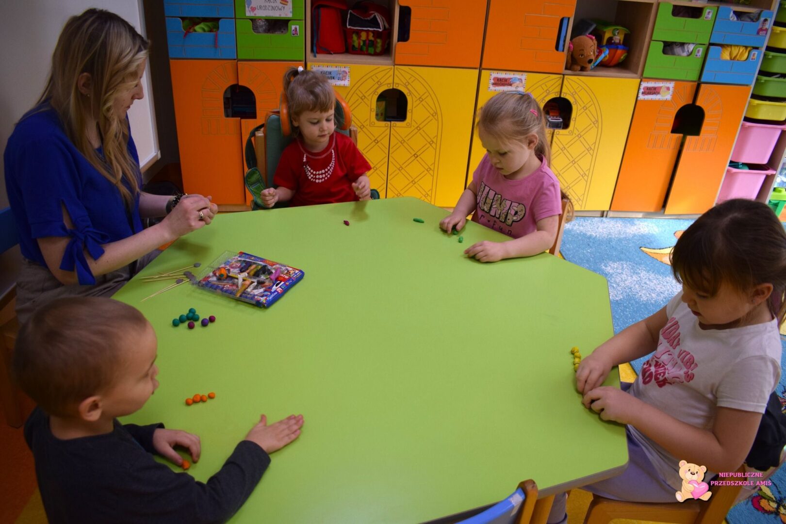 Rozwijaliśmy również motorykę małą – przedszkolaki toczyły kuleczki z plasteliny oraz nawlekały plastelinowe korale na patyk, ćwicząc sprawność paluszków i koncentrację.