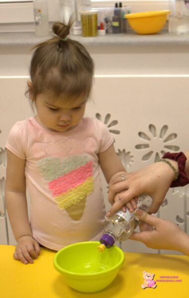 – Sensoplastyki. Dzieci wykonywały masę sensoryczną zwaną slimem. Proporcjowały składniki, dodawały również brokat oraz barwniki
