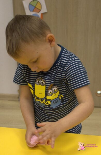 Mieszaliśmy do połączenia się składników, następnie wyrabialiśmy i ugniataliśmy naszą masę w raczkach Celem zajęć był trening skupienia, motoryki małej oraz koordynacji wzrokowo- ruchowej.