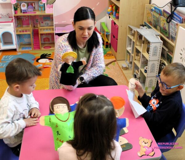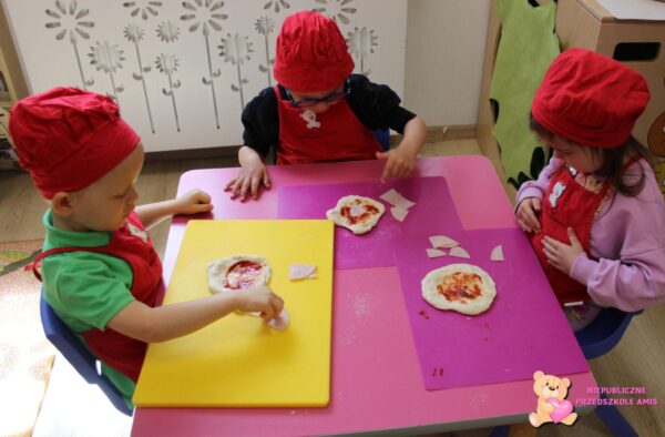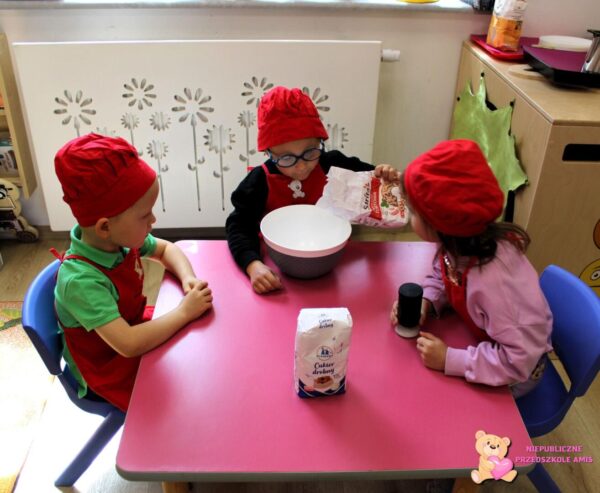omawiały blok tematyczny poświęcony pracy zawodowej oraz jak powstają różne produkty, np. ciasto. Na zajęciach dydaktycznych dzieci dopasowywały marionetki do odpowiedniej planszy z zawodem, wykonały karty pracy, laurki na zbliżający się Dzień Matki oraz krok po kroku zrobiły ciasto na pizze
