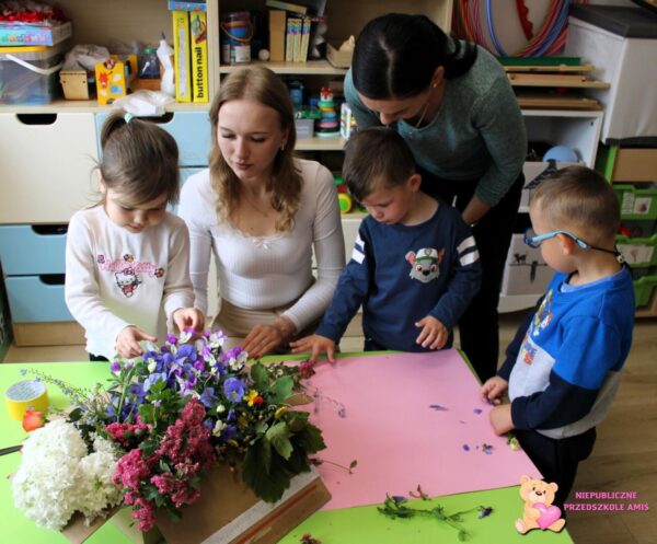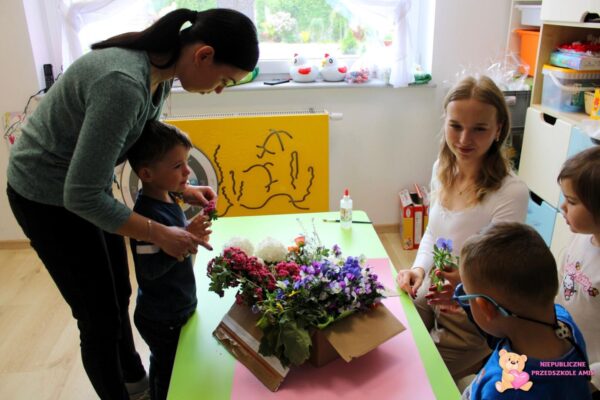 , którą potem udekorowały. Po upieczeniu Amisiaki ze smakiem zajadały się własnymi wypiekami. Nie zabrakło zajęć z języka angielskiego, na których dzieci uczyły się piosenki „Mother Day” oraz sensoplastyki, gdzie za pomocą świeżych kwiatów dzieci stworzyły makietę ogrodu![]()